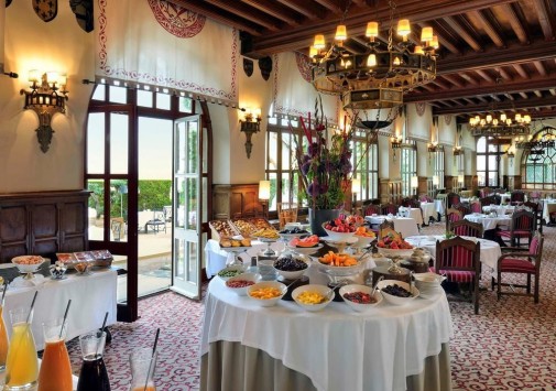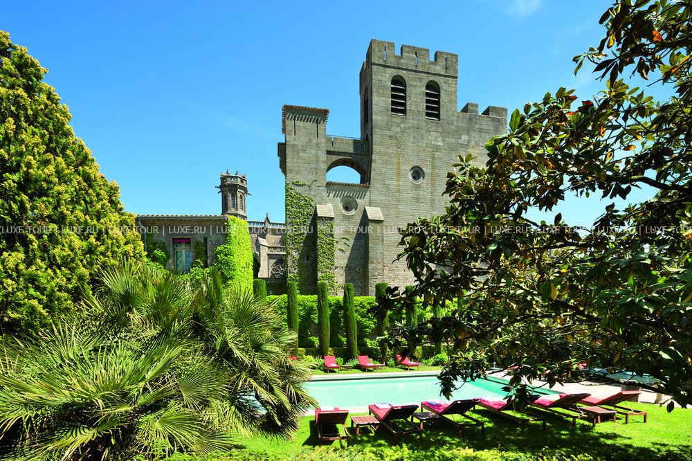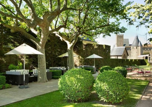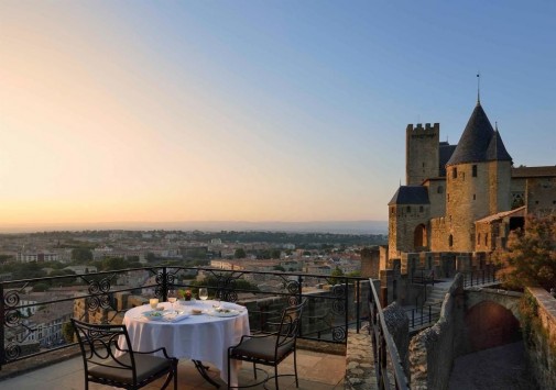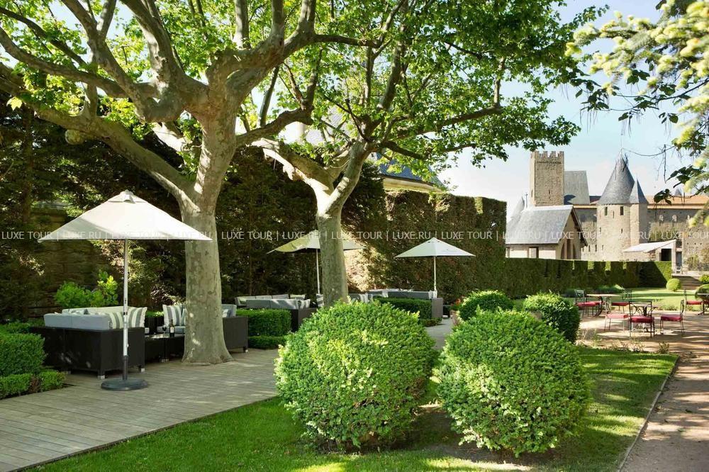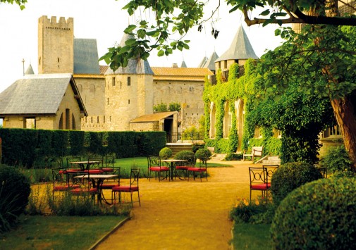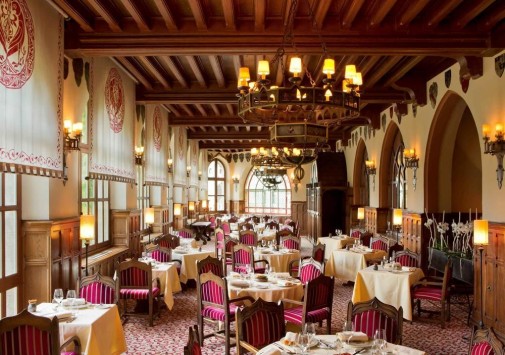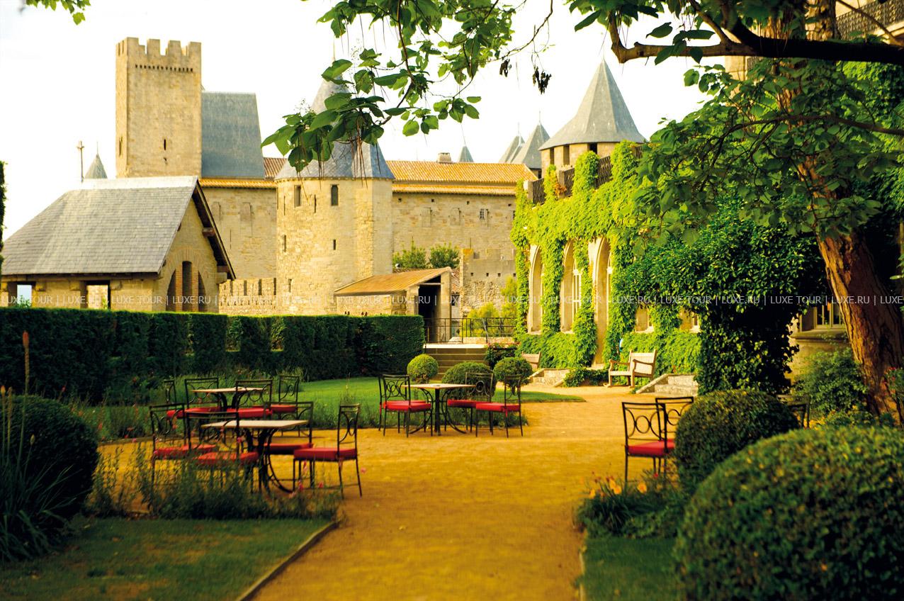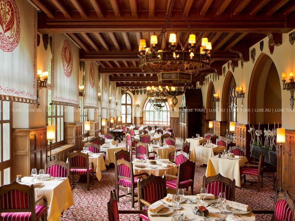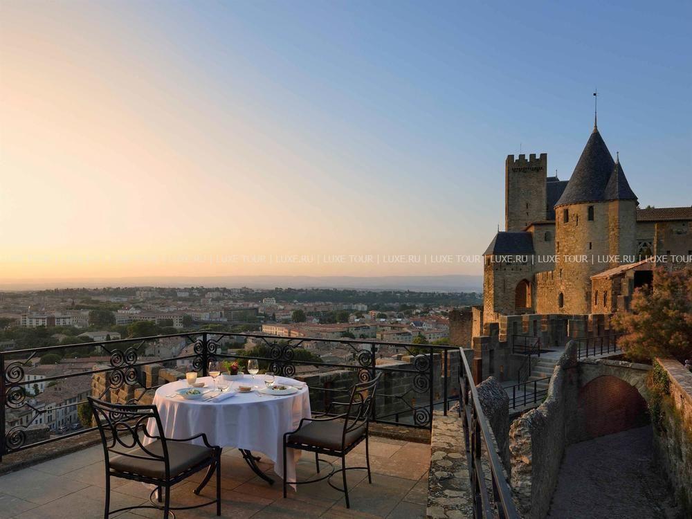 Неоготический стиль ресторана с величественными каминами, высокими потолками и витражами создают особенную атмосферу, гармонирующую с видом на сады отеля, Цитадель и далекий контур Каркасона. Ресторан открыт с 1 мая по 30 октября.