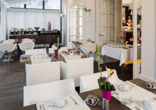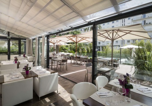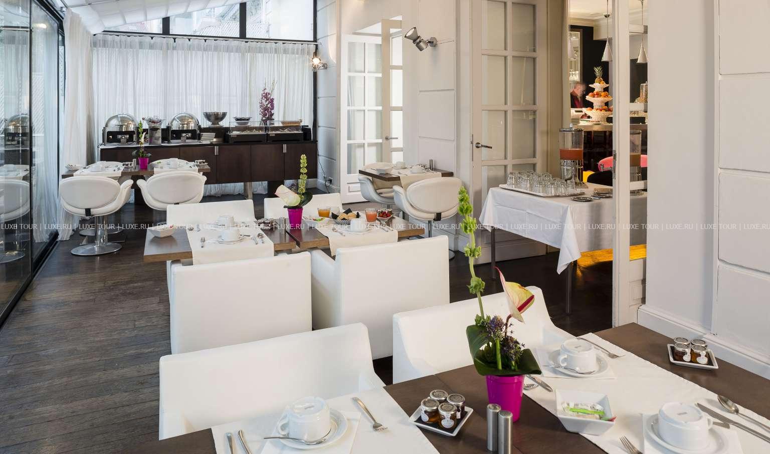 Гостям предлагается трапеза на залитой солнцем веранде с огромными окнами, которые открываются летом. Стильная мебель гармонирует с декором отеля и создает уникальную атмосферу.