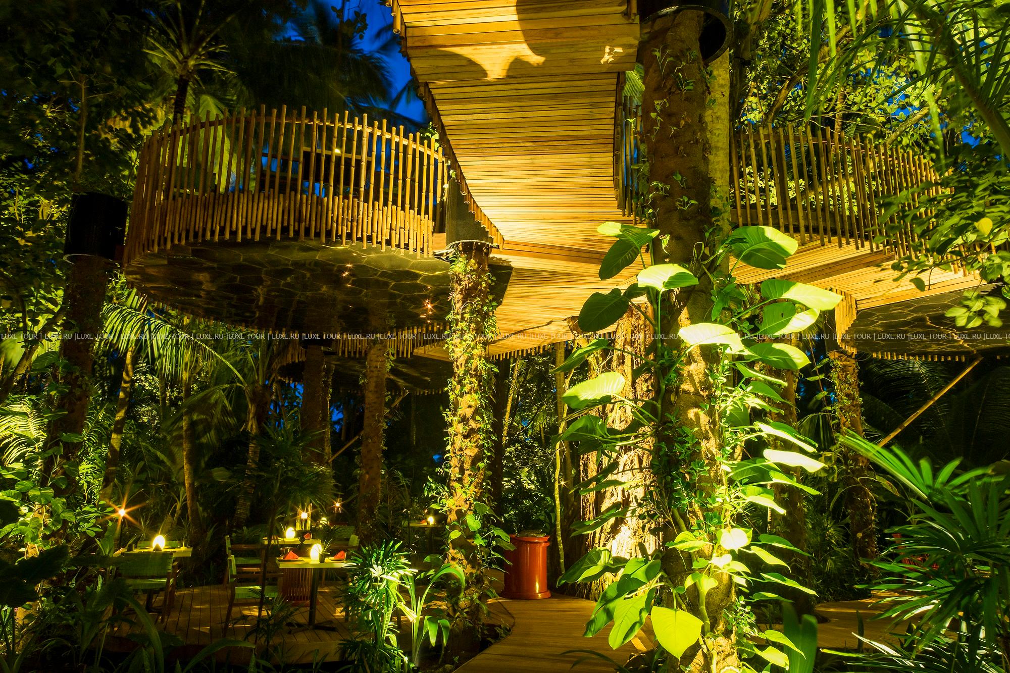 • Эксклюзивный ресторан Nest, столики которого располагаются среди лиан на первом этаже и на платформах шестиметровой высоты среди крон деревьев, предлагает кухню Юго-Восточной Азии с креативным подходом.