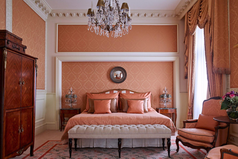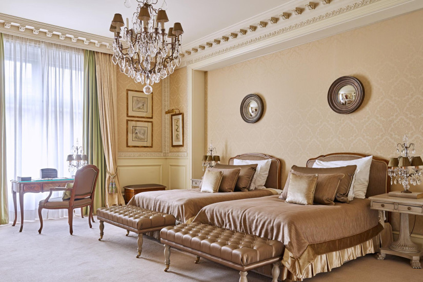 - 116 м2. Просторный номер с элегантным интерьером, выдержанный в светло-абрикосовых тонах, с изысканной лепниной и изящной мебелью состоит из спальни с кроватью king-size или двумя кроватями twin, гостиной, столовой, которая может использоваться как комната для переговоров, мини-кухни, гардеробной, большой ванной комнаты, гостевой туалетной комнаты. Вид на город.