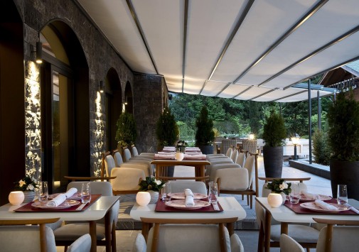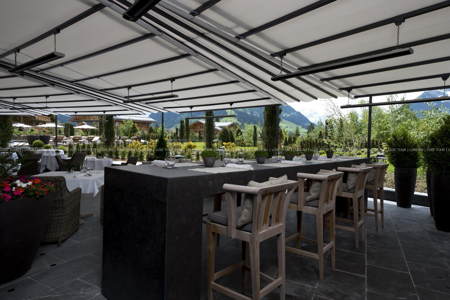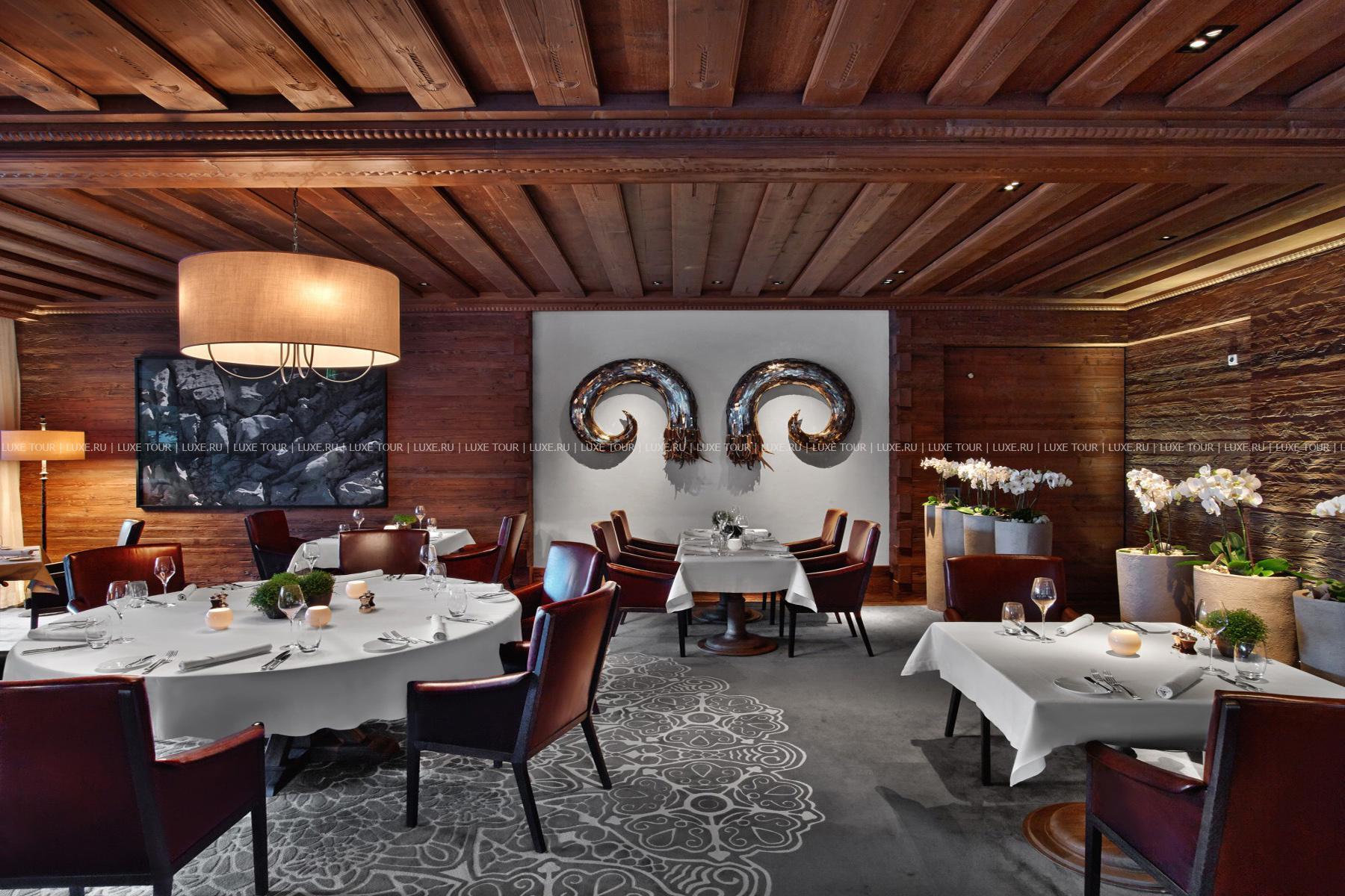 - Sommet – элегантный гастрономический ресторан, оформленный в альпийском стиле, с отделкой из резного дерева, имеет 1 звезду Michelin и отмечен 18 баллами GaultMillau. К превосходным блюдам предлагается богатая винная карта, включающая более 400 марок лучших вин со всего света. Летом изысканными блюдами и винами можно насладиться на открытой террасе с захватывающим видом на горы.
