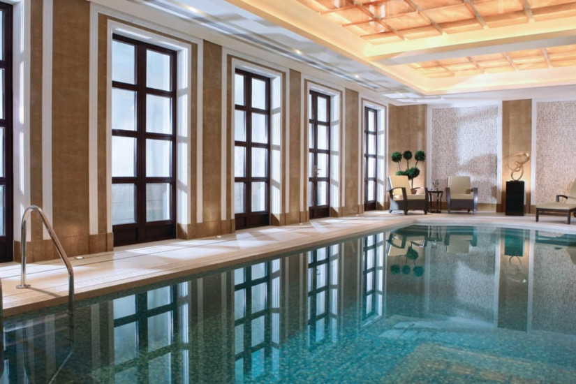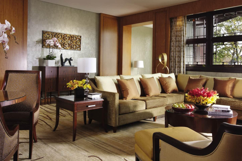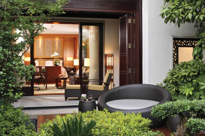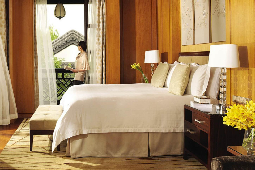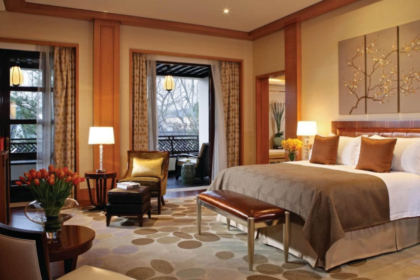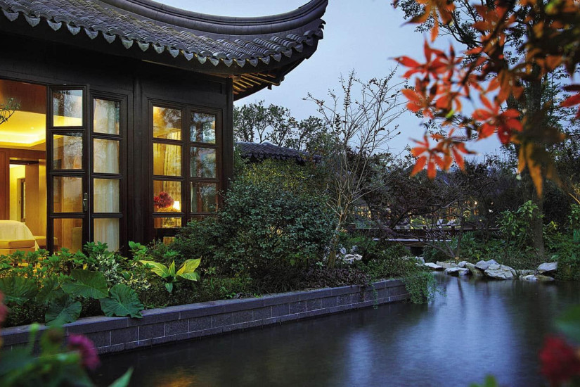 - 920 м2. Фешенебельная трехэтажная вилла в стиле Цзяннань, расположена рядом со зданием отеля и включает: три спальни с кроватями king-size и ванными комнатами, просторную гостиную, столовую, семейную гостиную, кинозал (38 м2), винотеку, тренажерный зал (34 м2), сауну, кухню, две комнаты для прислуги, прачечную, большой частный сад с зоной отдыха, террасы, крытый бассейн и джакузи, гараж. Вид на сад. Максимальное размещение – 9 взрослых или 6 взрослых + 3 ребенка.