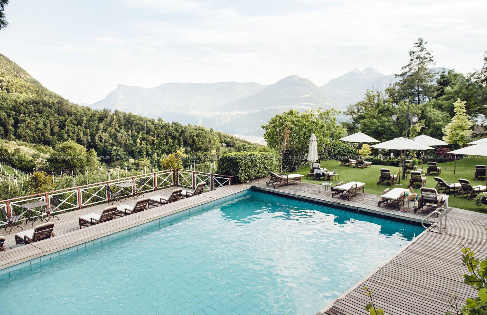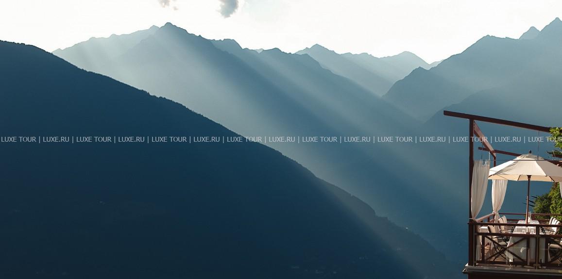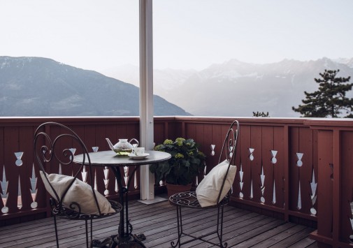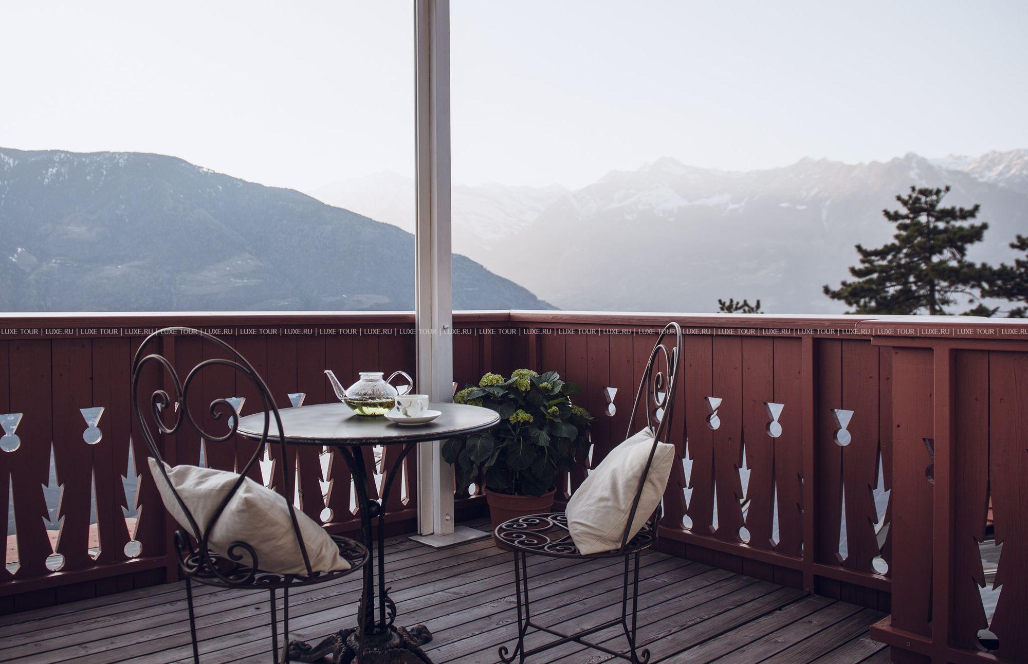 Летом работает солнечная терраса с захватывающим панорамным видом на долину Мерано и Доломитовые Альпы.