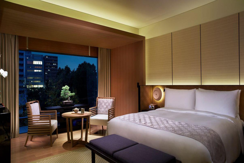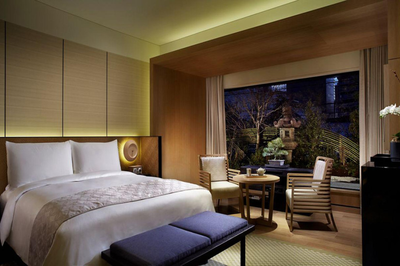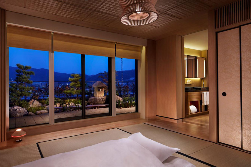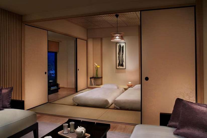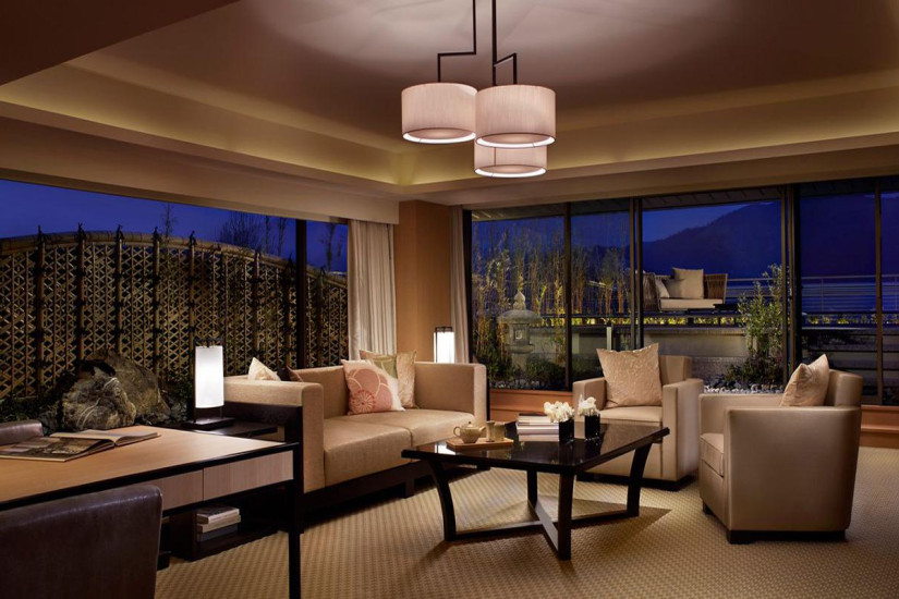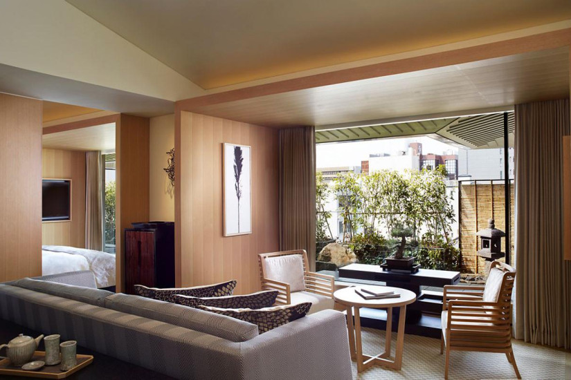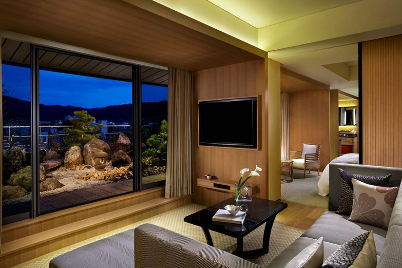 - 140 м2. Состоит из спальни с кроватью king-size, гостиной, ванной комнаты, гардеробной, террасы с традиционными японскими светильниками, садом и панорамным видом на горы Хигасияма. Располагается на 5 этаже. Размещение – 2 взрослых.