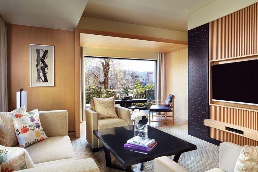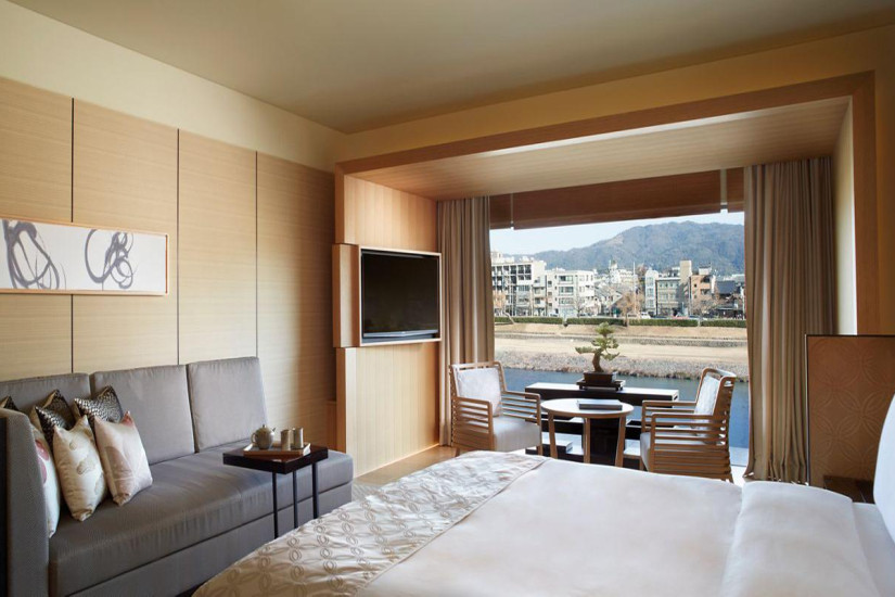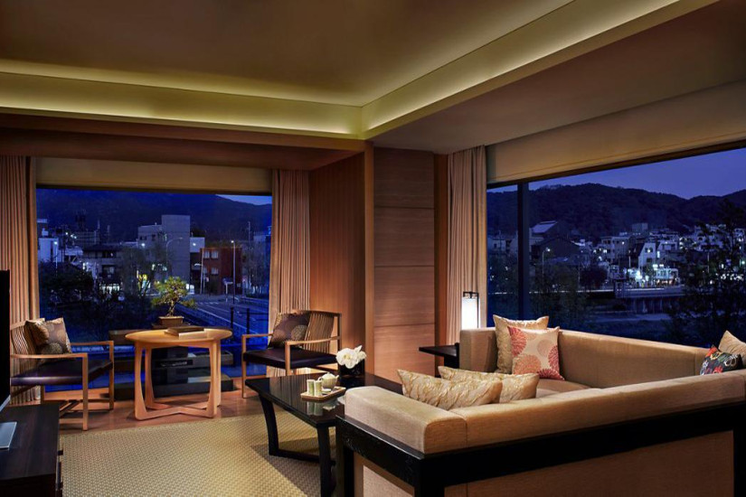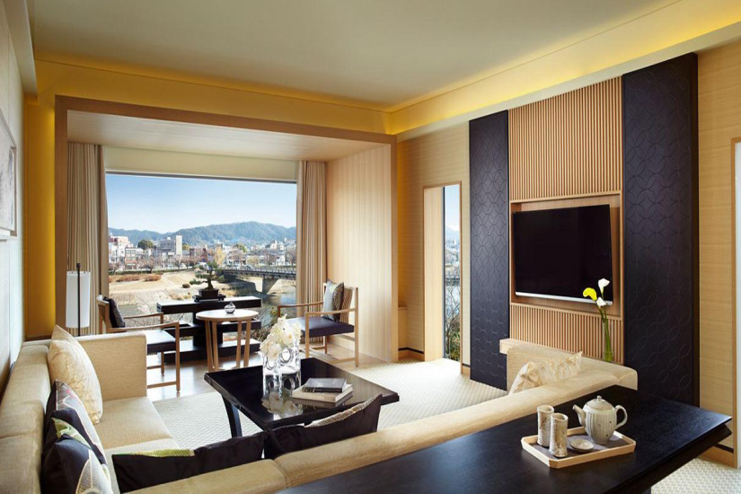 - 115 м2. Состоит из спальни с кроватью king-size, гостиной с двумя панорамными окнами, ванной комнаты с традиционной японской ванной и душем. Имеет панорамный вид на старый Киото и реку Камо. Номера располагаются на 3 и 4 этаже. Размещение – 2 взрослых.