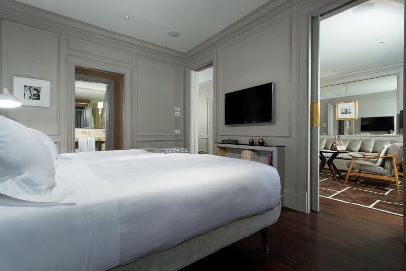 - 58 м2. Состоит из спальни с кроватью king-size или двумя кроватями twin, гостиной, которая может быть использована как дополнительная спальня, обеденной зоны с мини-кухней, ванной комнаты (в некоторых номерах две ванные комнаты – одна с ванной и душем, другая с душем), двух гардеробных.
