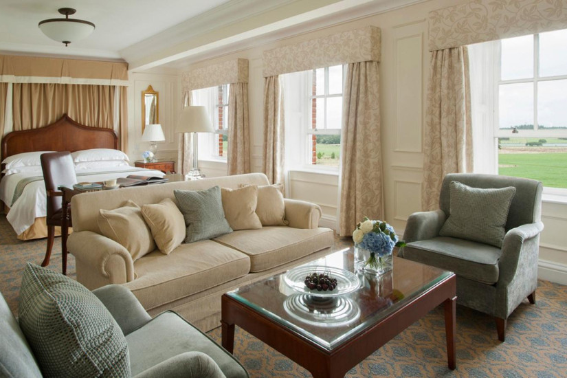 - 45 м2. Расположен в южном крыле отеля, состоит из спальни с кроватью king-size или двумя кроватями twin, зоны отдыха, ванной комнат. Вид на конюшни XVIII века. Максимальное размещение – 3 взрослых или 2 взрослых + 1 ребенок.