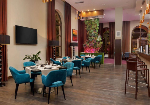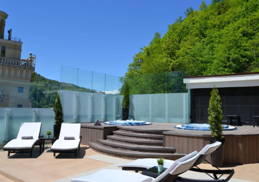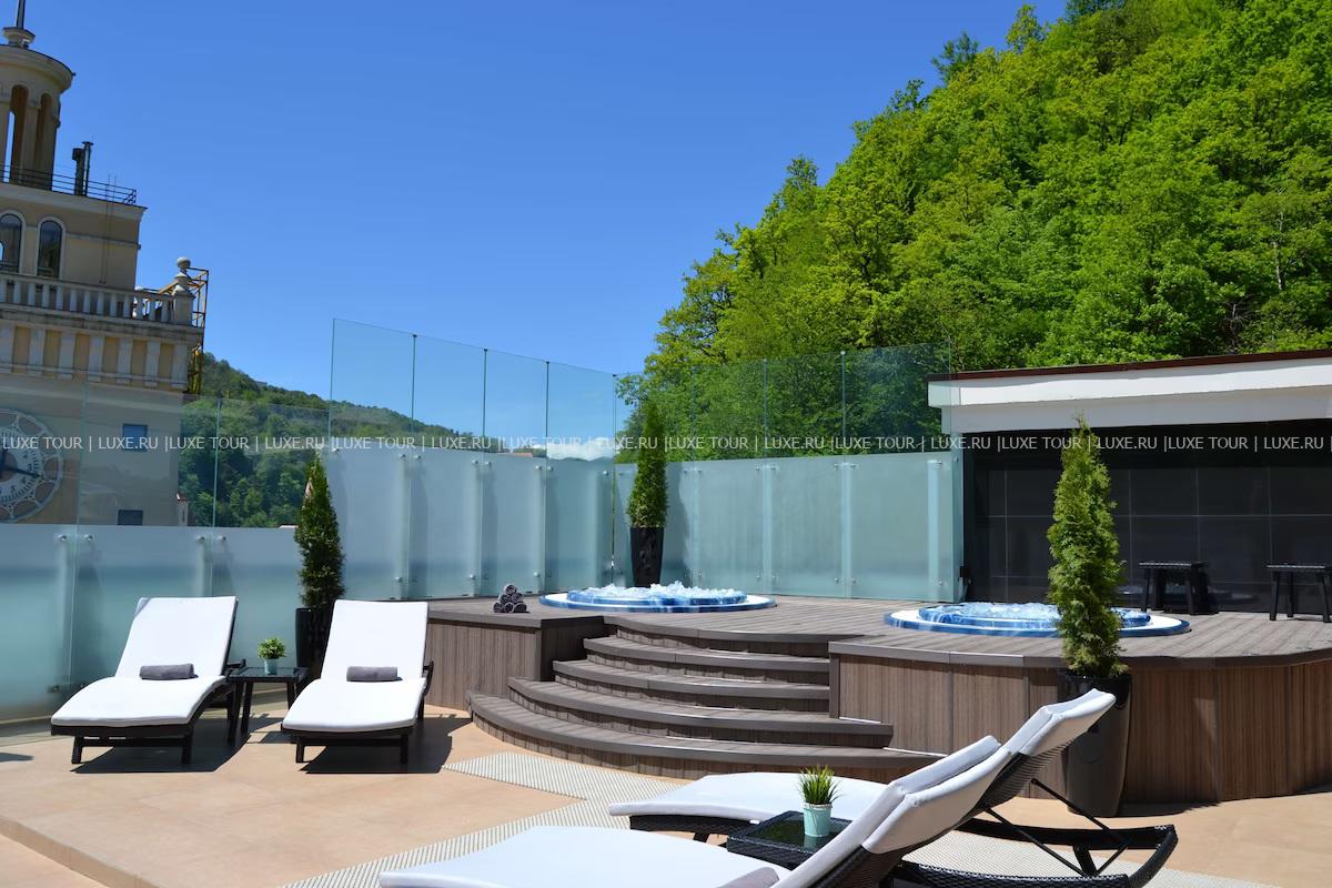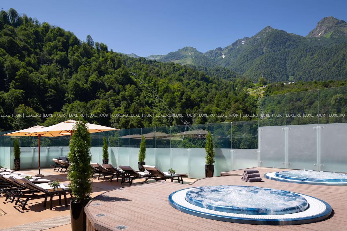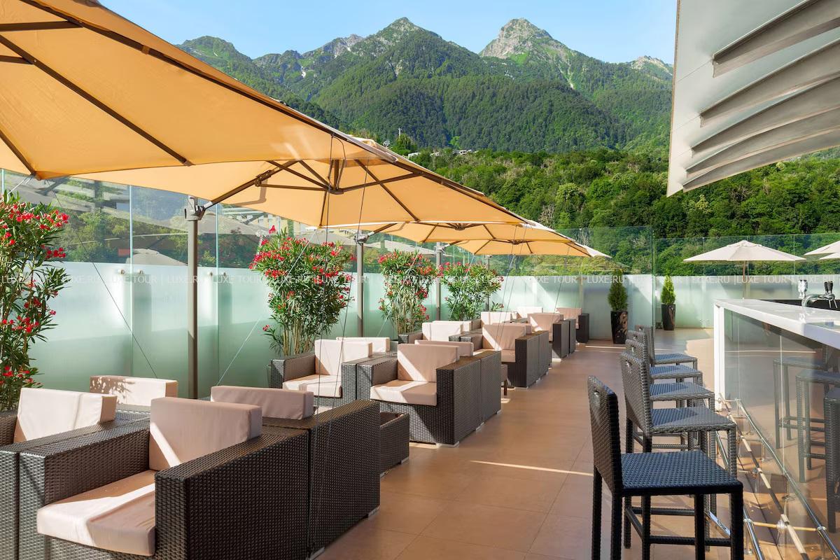 - Лаундж-бар Sky с открытой террасой на крыше и панорамным видом на горы – идеальное место для отдыха за коктейлем или бокалом вина.