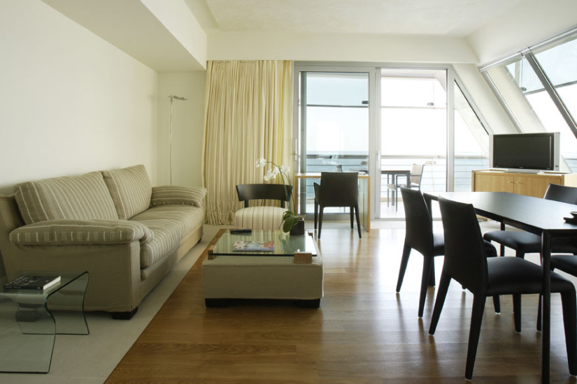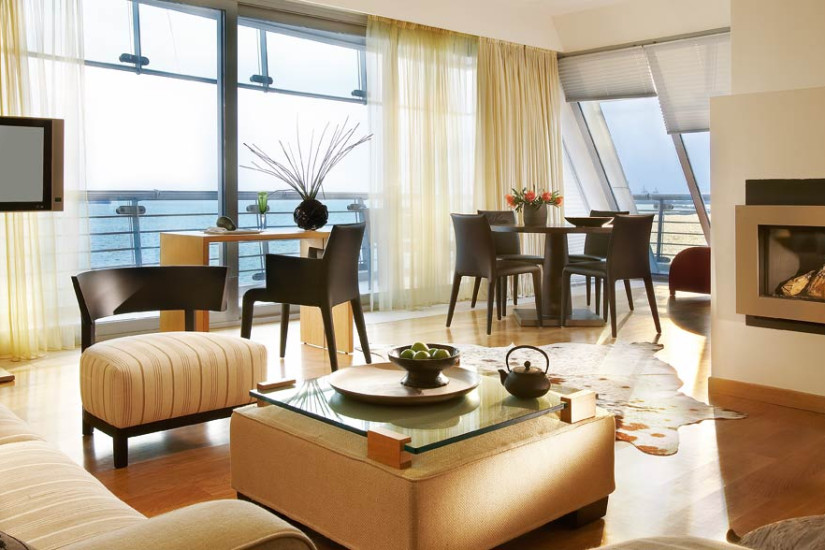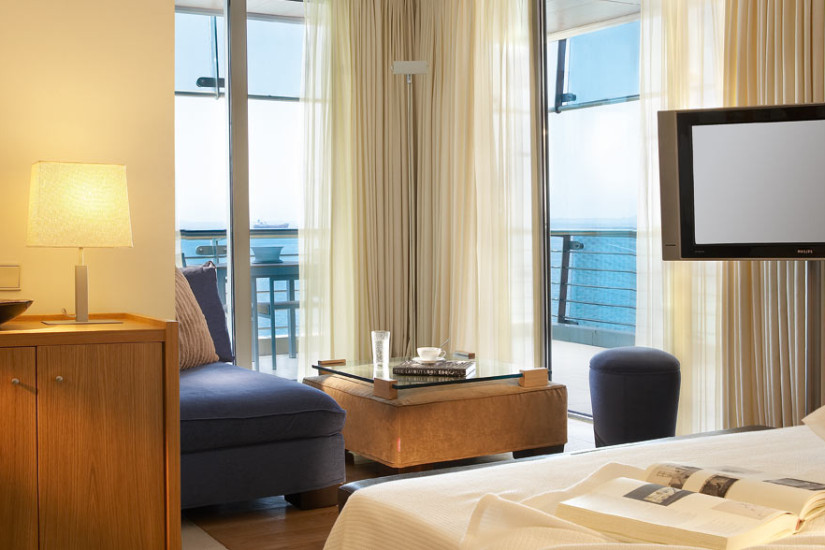 - – 100 м2. Роскошный номер, стилизованный под яхту роскошного круизного лайнера, состоит из просторной спальни с кроватью king-size, гостиной с обеденной и рабочей зонами, ванной комнаты с ванной и кабиной, оборудованной «ливневым» душем, большой меблированной террасы с панорамным видом на море.