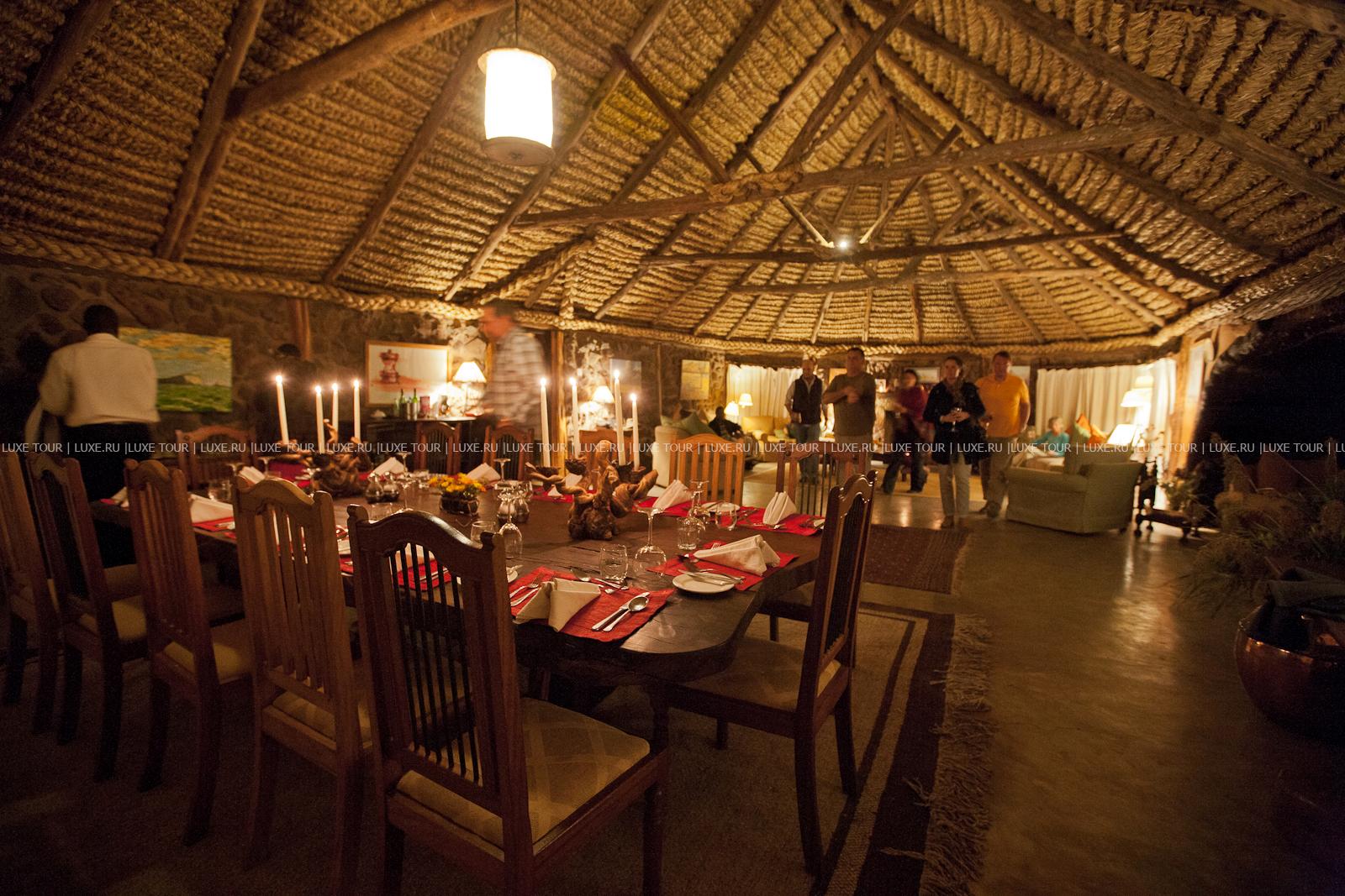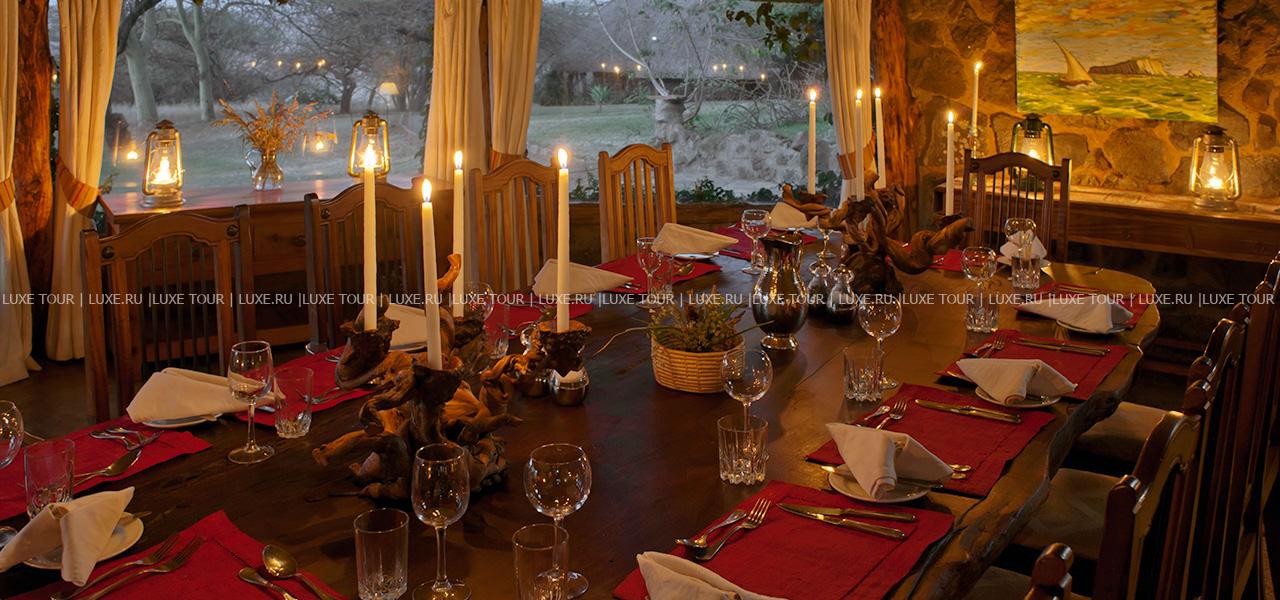 В ресторане с большим открытым камином и верандой с панорамным видом на заповедник предлагаются блюда африканской и интернациональной кухни, приготовленные из свежих продуктов, в том числе, овощей и фруктов из сада отеля. В уютной гостиной можно отдохнуть за бокалом вина или чашечкой послеобеденного чая.