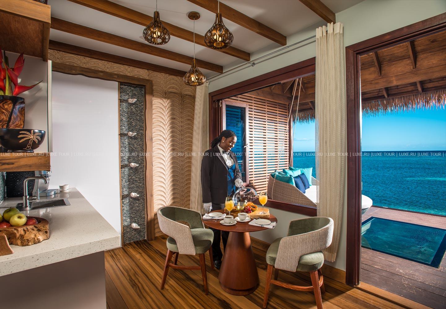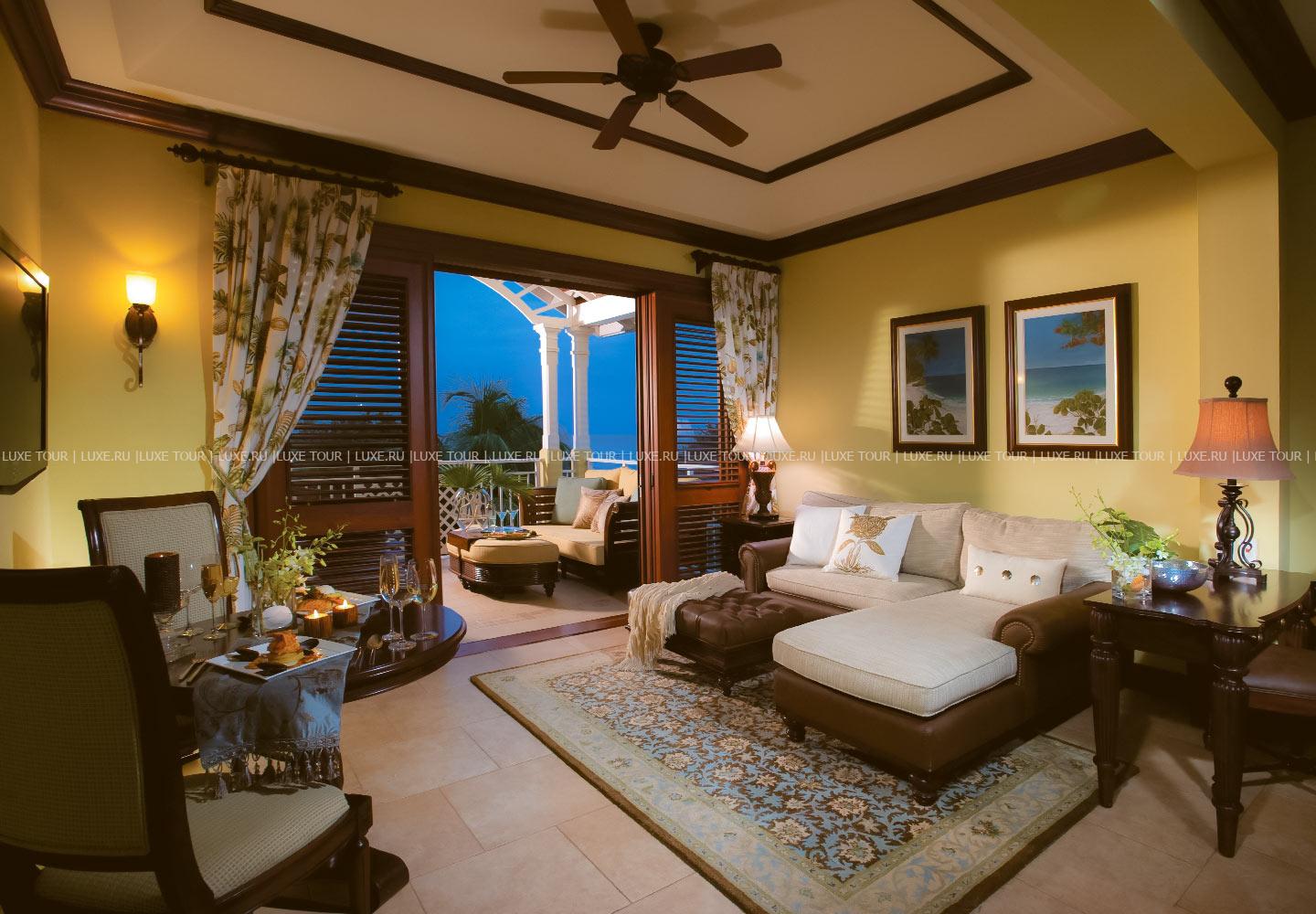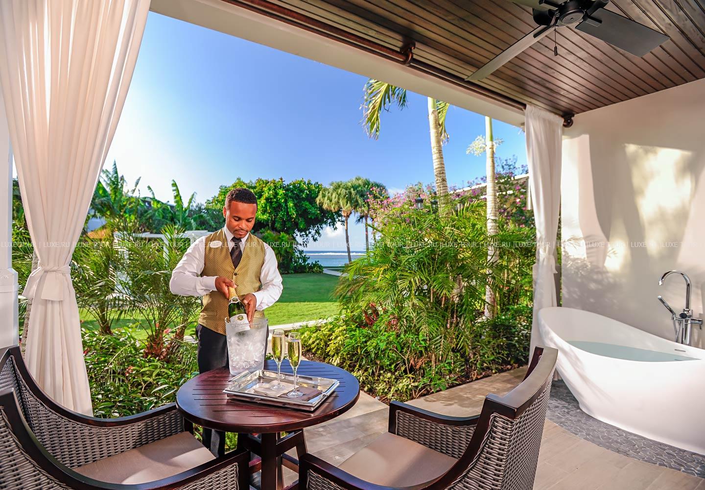 - Предлагается обслуживание в номерах и доступ в 12 ресторанов соседних отелей сети Sandals.
