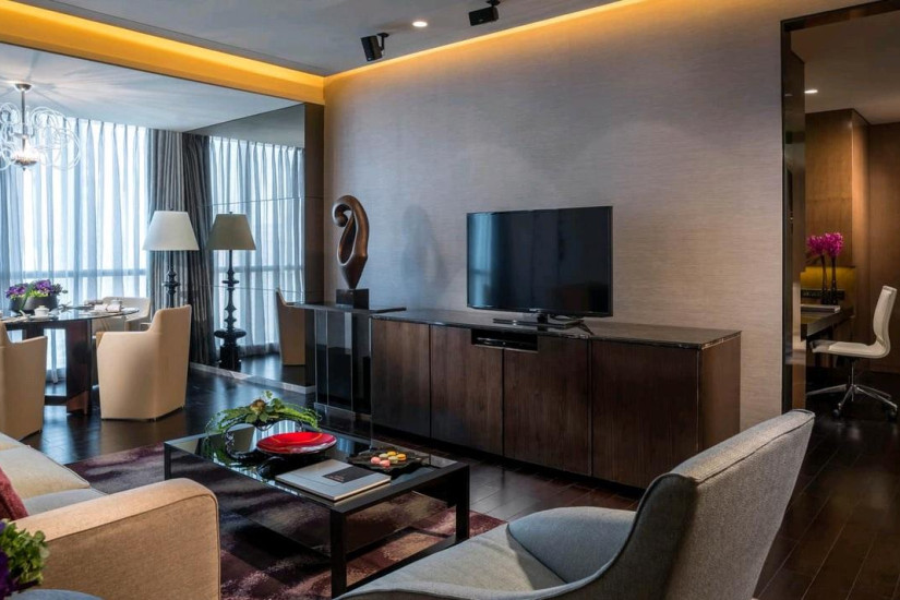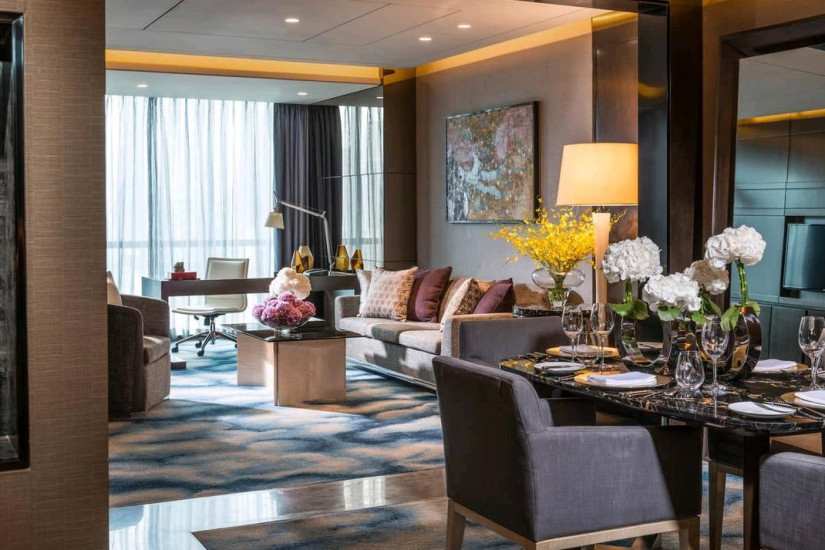 - 93-103 м2. Состоит из спальни с кроватью king-size или двумя двуспальными кроватями, гостиной с обеденной зоной, ванной комнаты с ванной и душем, гостевой туалетной комнаты. Вид на сад. Номера располагаются на 9 и с 11 по 30 этажи. Максимальное размещение – 3 взрослых или 2 взрослых + 1 ребенок.
