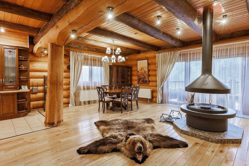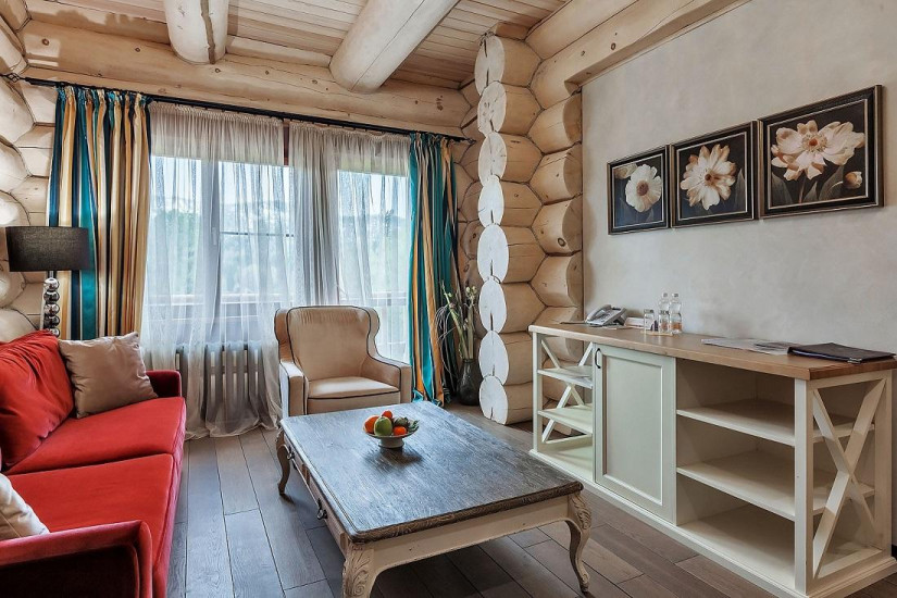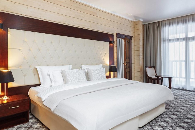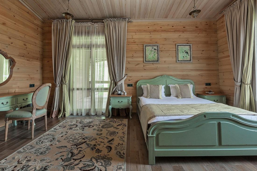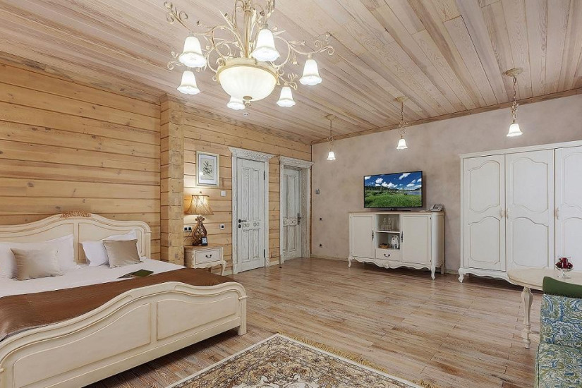 - 40 м2. Находится в коттеджах из клеёного бруса сосны в духе швейцарского шале. Состоит из спальни с выходом на балкон/террасу, ваннаой комнаты/душевой кабины, зоны отдыха, также имеется общая зона с камином в коттедже. Мебель, люстры, настольные лампы и элементы декора, выдержанные в стиле неоклассика, смотрятся особенно благородно и выразительно на фоне сдержанности эко-дизайна в интерьере номера. В отделке применены только натуральные материалы – дерево и текстиль светлых оттенков. Обстановка передает атмосферу комфортабельной загородной жизни. А уютные вечера, проведенные у потрескивающего камина, всегда будут согревать в воспоминаниях.