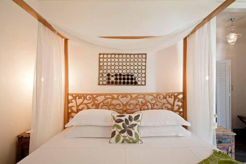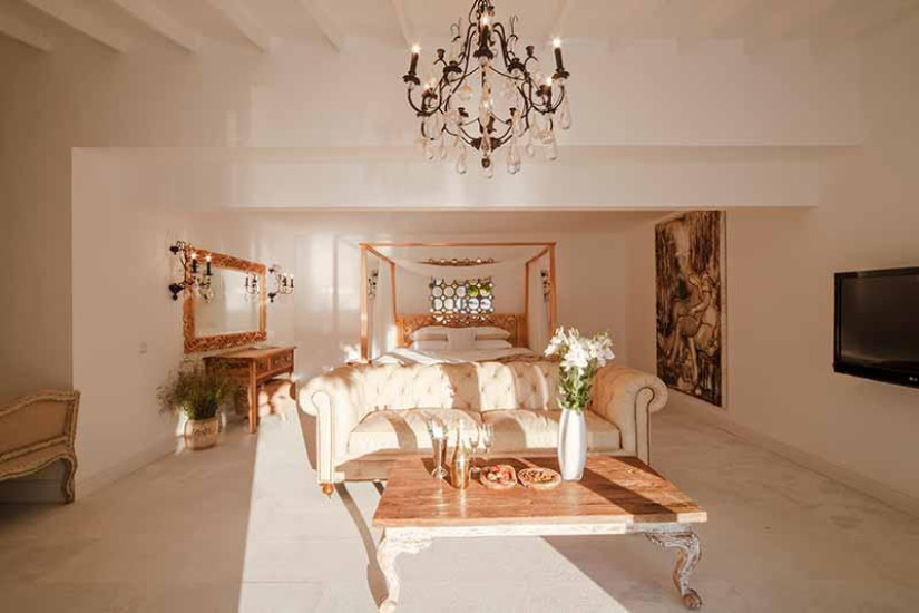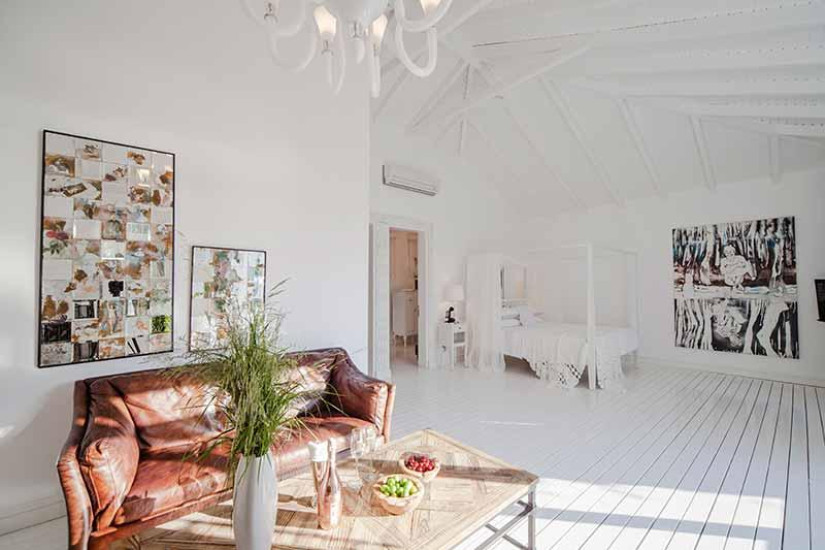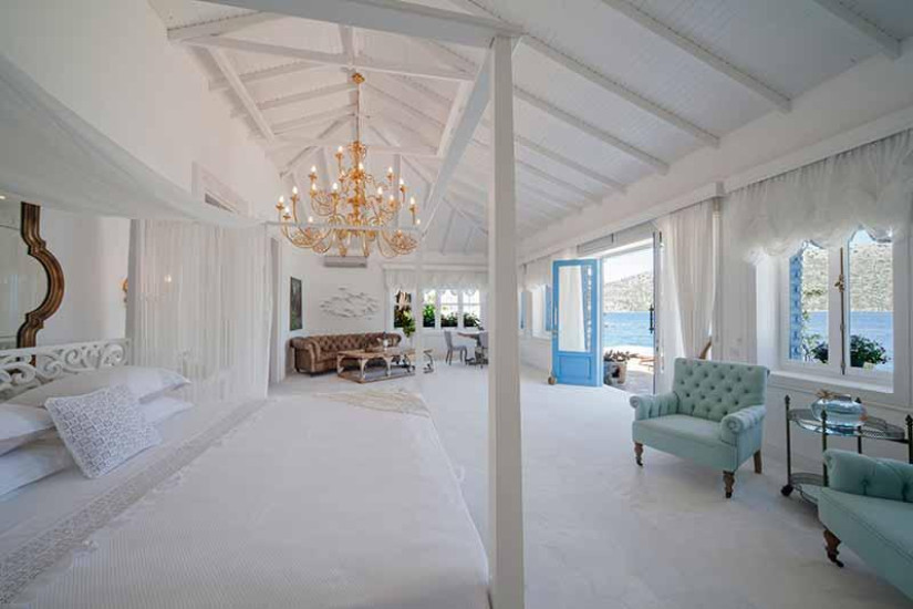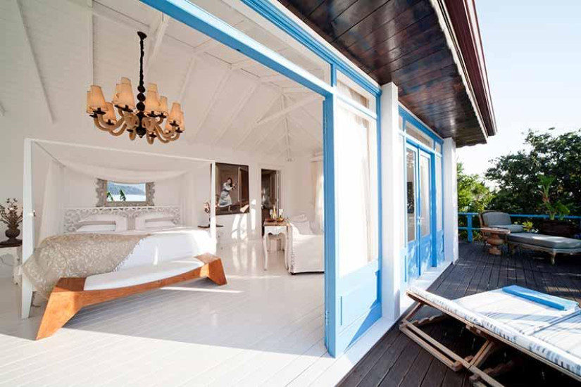 - 80 м2 + терраса 40 м2. Состоит из спальни с кроватью king-size под пологом, гостиной зоны с камином, обеденной зоной и зоной отдыха с диваном, большой гардеробной (10 м2), ванной комнаты, террасы с открытой джакузи под навесом, садом, зоной отдыха, обеденной зоной, панорамным видом на море и выходом к пляжу.
