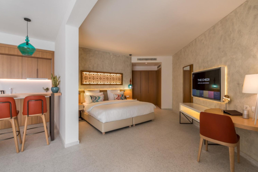 - 47 м2. Состоит из спальни с кроватью king-size или двумя кроватями twin и зоной отдыха с диваном, мини-кухни, ванной комнаты с ливневым душем и ванной у окна, дополнительной туалетной комнаты, балкона с видом на горы. Максимальное размещение – 2 взрослых или 2 взрослых + 1 ребенок.