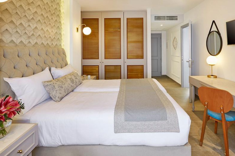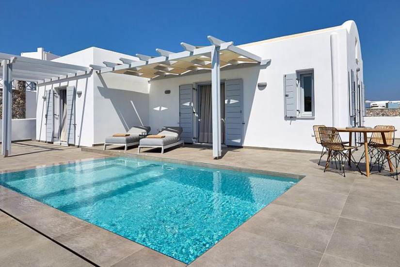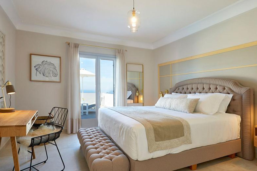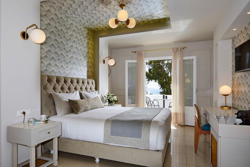 - В отеле 45 номеров различных категорий, включая 38 Guest Rooms, 7 Suites и Villa. Просторные светлые номера сочетают изысканный декор в средиземноморском стиле и современный комфорт, а с балконов и террас открывается прекрасный вид на виноградники, лазурное море и чарующие пейзажи Санторини.