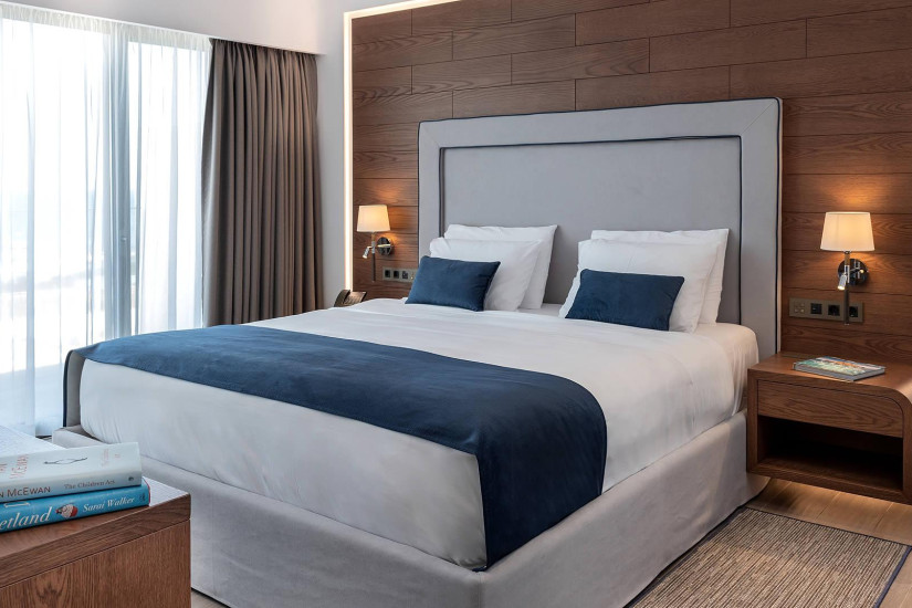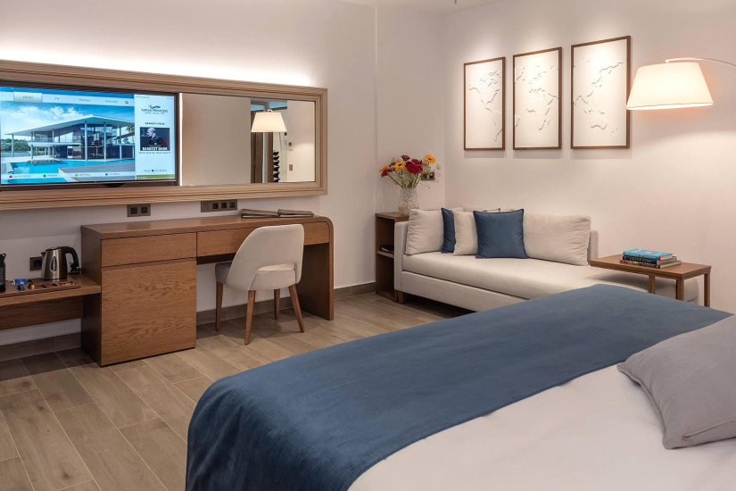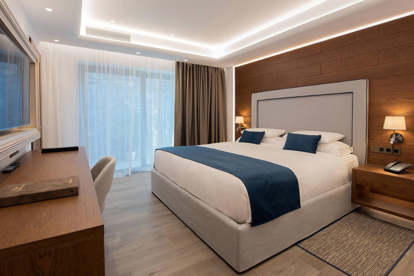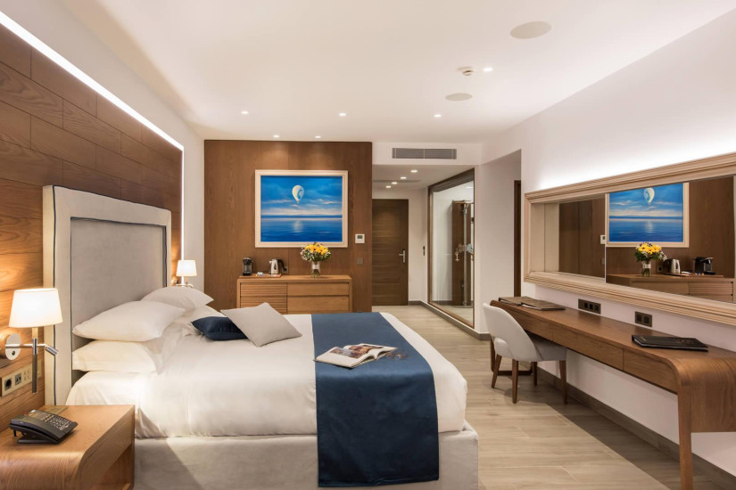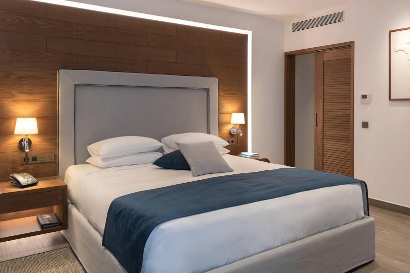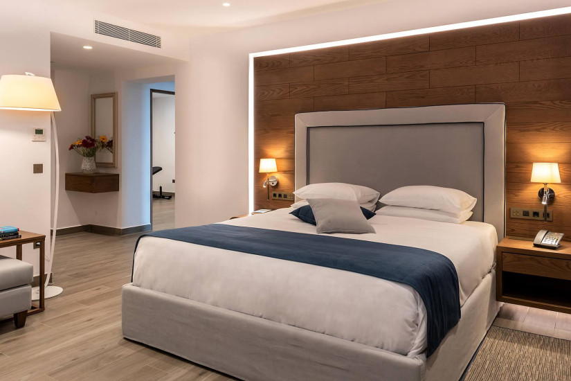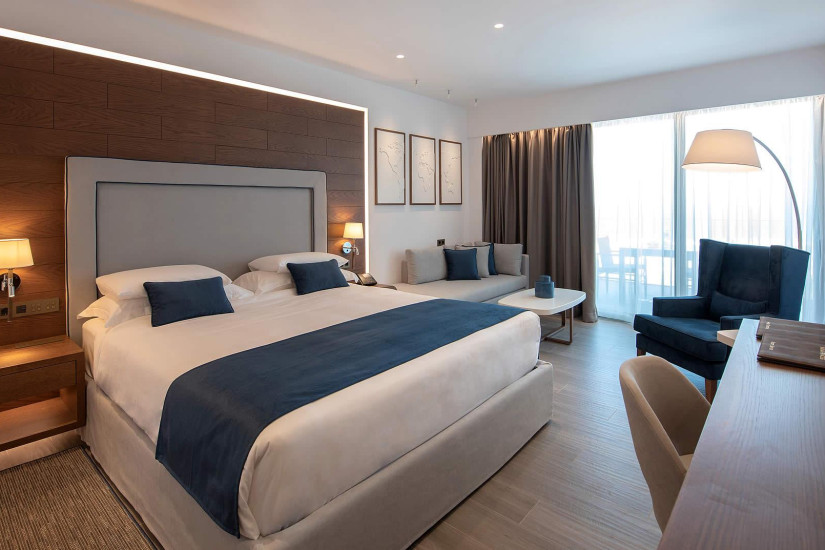 - 42 м2 + балкон 7 м2. Состоит из спальни с кроватью king-size и зоной отдыха с диваном, гардеробной, ванной комнаты с ванной и душем, балкона с зоной отдыха и видом на море. Номера располагаются на верхнем этаже. Максимальное размещение – 3 взрослых или 2 взрослых + 1 ребенок.