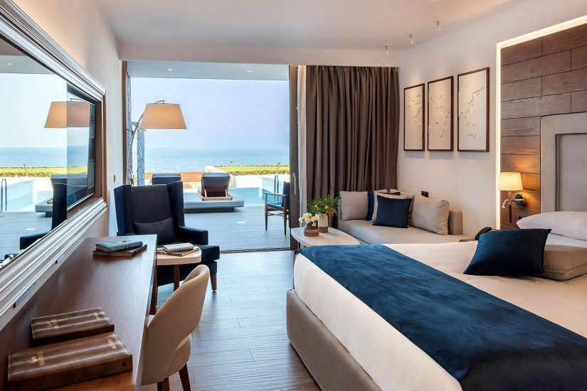 - В отеле 112 номеров различных категорий, включая Guest Room, Suite и Villa. Просторные номера декорированы в элегантном современном стиле, оснащены с первоклассным комфортом и располагают балконами и террасами с чудесным видом на Критское море.