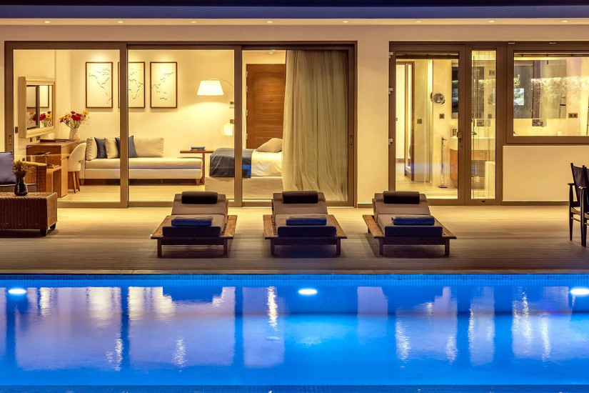 - 42 м2 + терраса 20 м2. Состоит из спальни с кроватью king-size и зоной отдыха с диваном, гардеробной, ванной комнаты с ванной и душем, террасы с подогреваемым бассейном (19 м2), зоной отдыха и видом на море. Максимальное размещение – 3 взрослых или 2 взрослых + 1 ребенок.