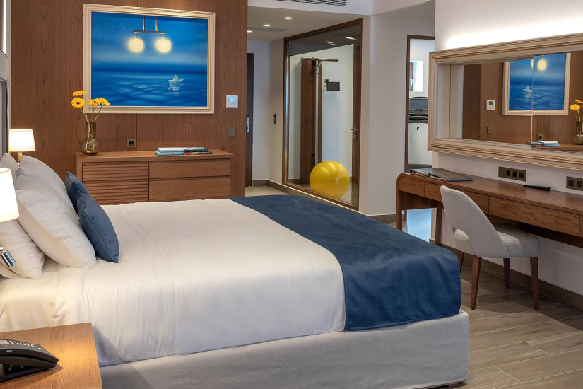 - 82 м2 + терраса 20 м2. Состоит из спальни с кроватью king-size, гостиной зоны отдыха с диваном, гардеробной, тренажерного зала, ванной комнаты с ванной и душем, террасы с джакузи (4 м2), зоной отдыха и видом на море. Номера располагаются ближе к морю. Максимальное размещение – 3 взрослых или 2 взрослых + 1 ребенок.