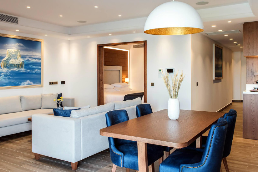 - 90 м2 + терраса 20 м2. Состоит из спальни с кроватью king-size, гостиной зоны отдыха с диваном, гардеробной, тренажерного зала, ванной комнаты с ванной и душем, террасы с джакузи (4 м2), зоной отдыха и панорамным видом на море. Номера располагаются на верхних этажах. Максимальное размещение – 3 взрослых или 2 взрослых + 1 ребенок.