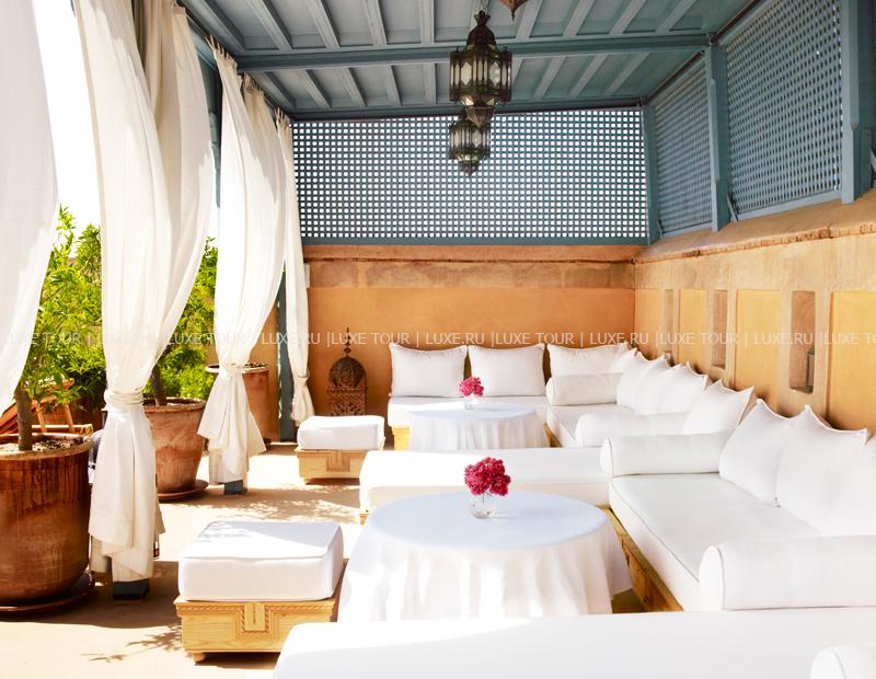 • На крыше риада находится живописная терраса с беседкой и благоухающим садом, где можно, любуясь великолепным панорамным видом на Марракеш и Атласские горы, насладиться изысканными блюдами, выпить чашечку ароматного марокканского чая или бокал освежающего напитка из свежих фруктов.