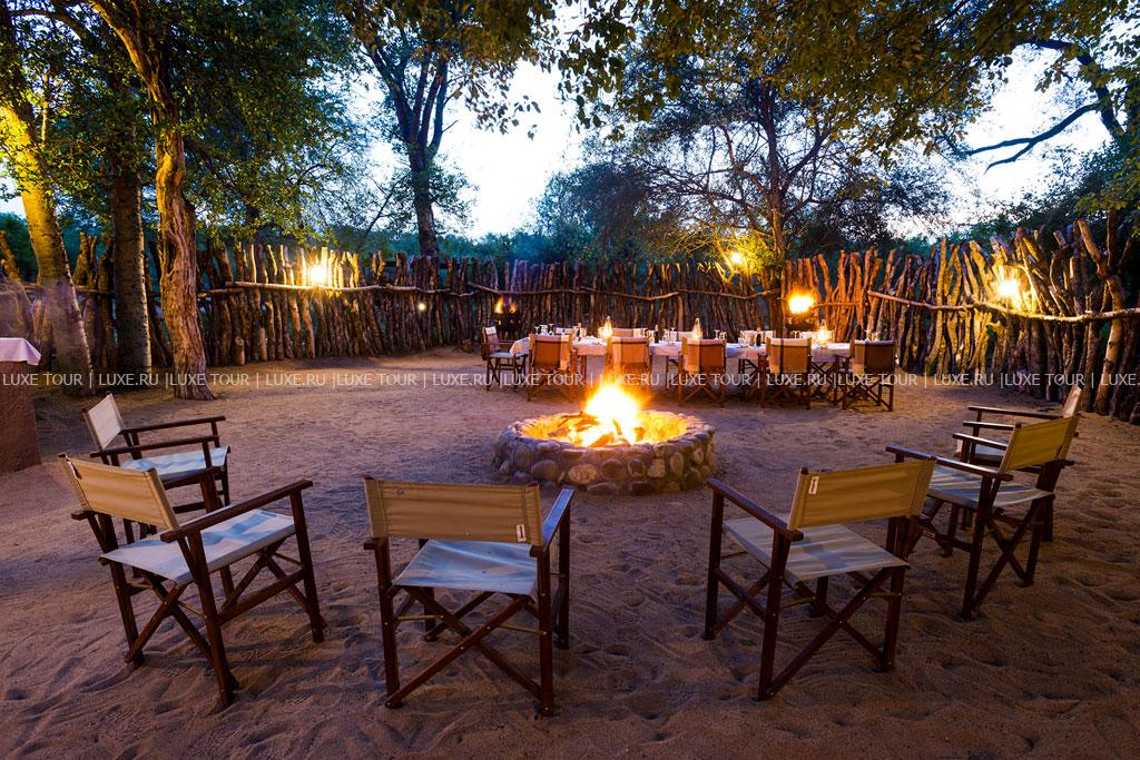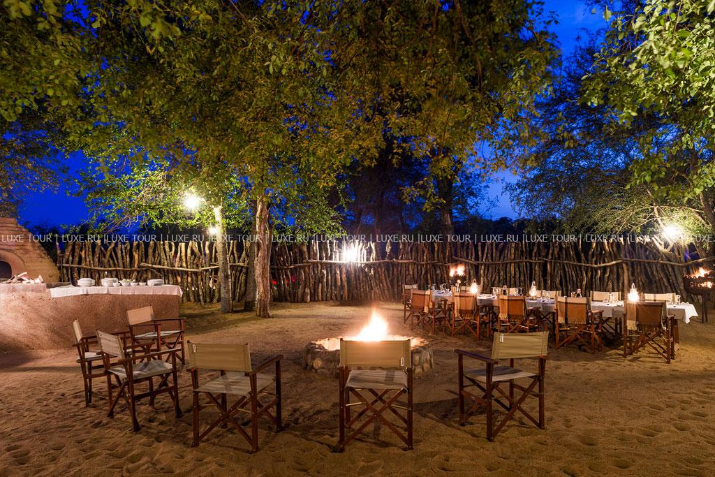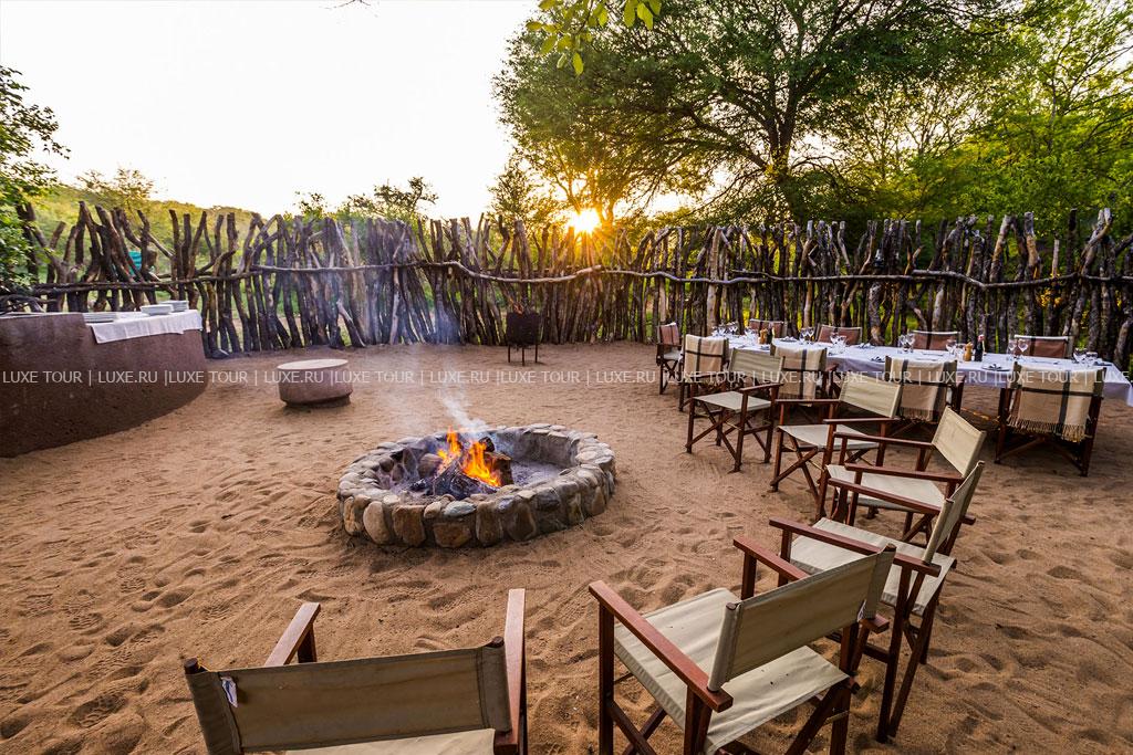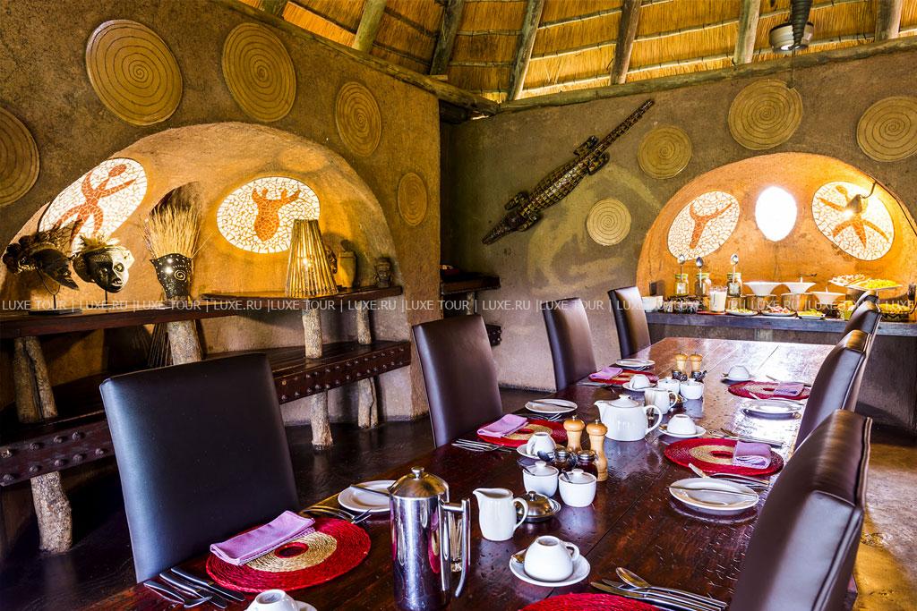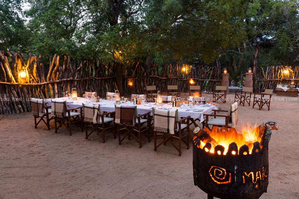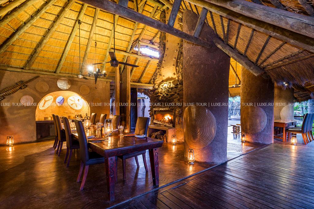 К услугам гостей рестораны типа «бома» (на открытом воздухе). Каждый из 4-х лагерей имеет собственный ресторан, где подают блюда в первую очередь разнообразной местной африканской кухни, хотя всегда можно заказать европейское меню. Завтраки, обеды или ужины сервируют также непосредственно в залах-гостиных бунгало. Для детей предусмотрено специальное меню, а для любителей здоровой пищи – диетическое. Возможна организация завтраков и ужинов на природе, в буше. Рядом с лобби работает бар.