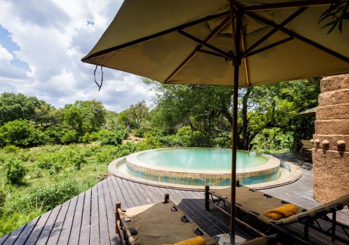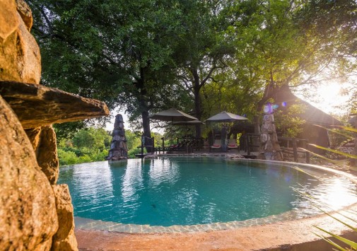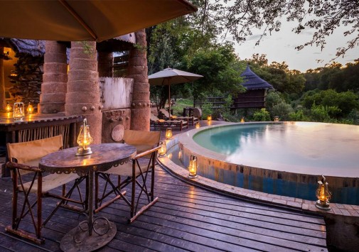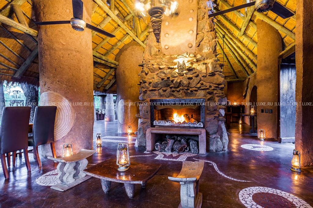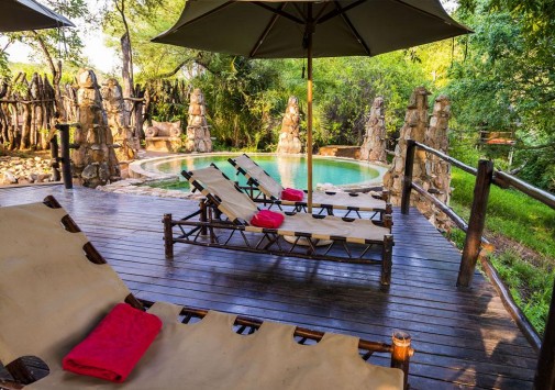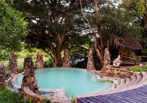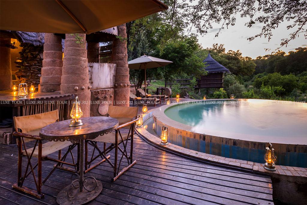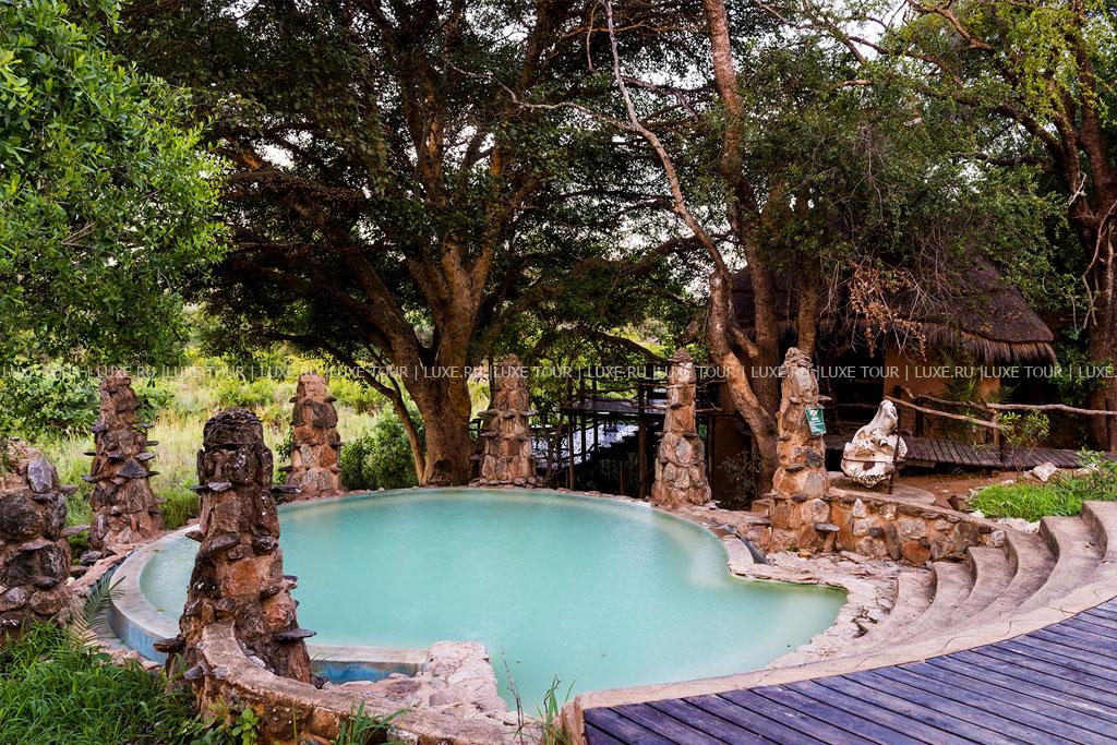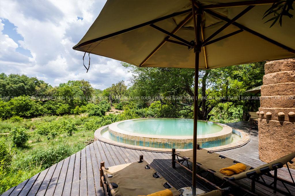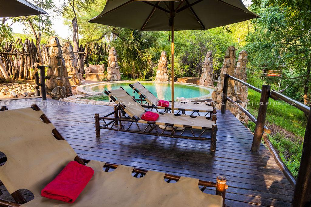 В каждом лагере отеля есть свой круглый открытый бассейн под соломенным навесом, декорированный в необычном африканском стиле.