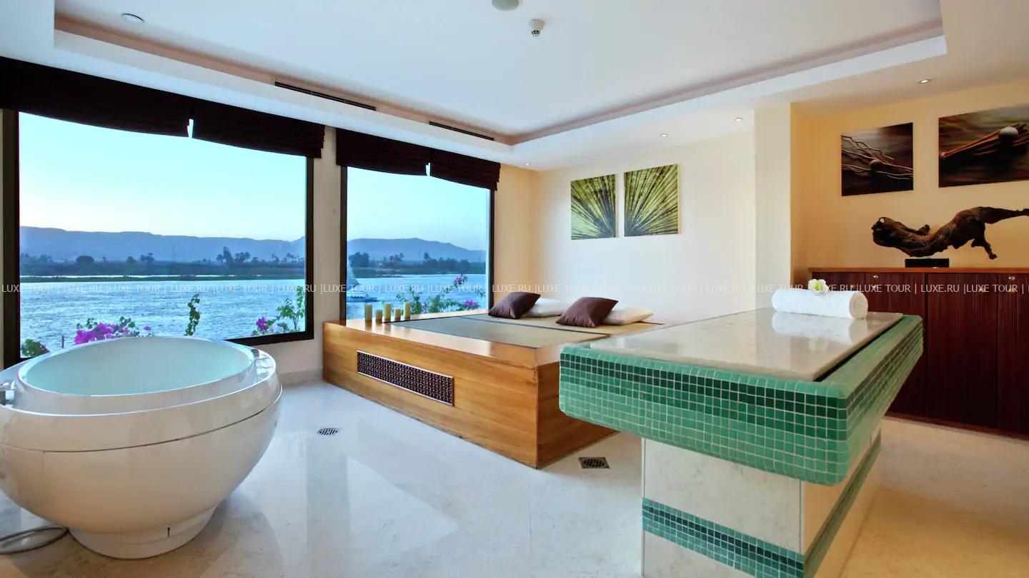 Отель располагает первоклассным Spa-центром, где на площади 1150 м2 находятся парные, ледяной фонтан, салон красоты, спа-бар, открытые и крытые зоны отдыха и 12 процедурных кабинетов с гидромассажными ваннами и видом на Нил и живописный сад. Спа-меню включает широкий спектр массажей и процедур по уходу за телом и лицом, основанных на балийских традициях и современных западных методиках.