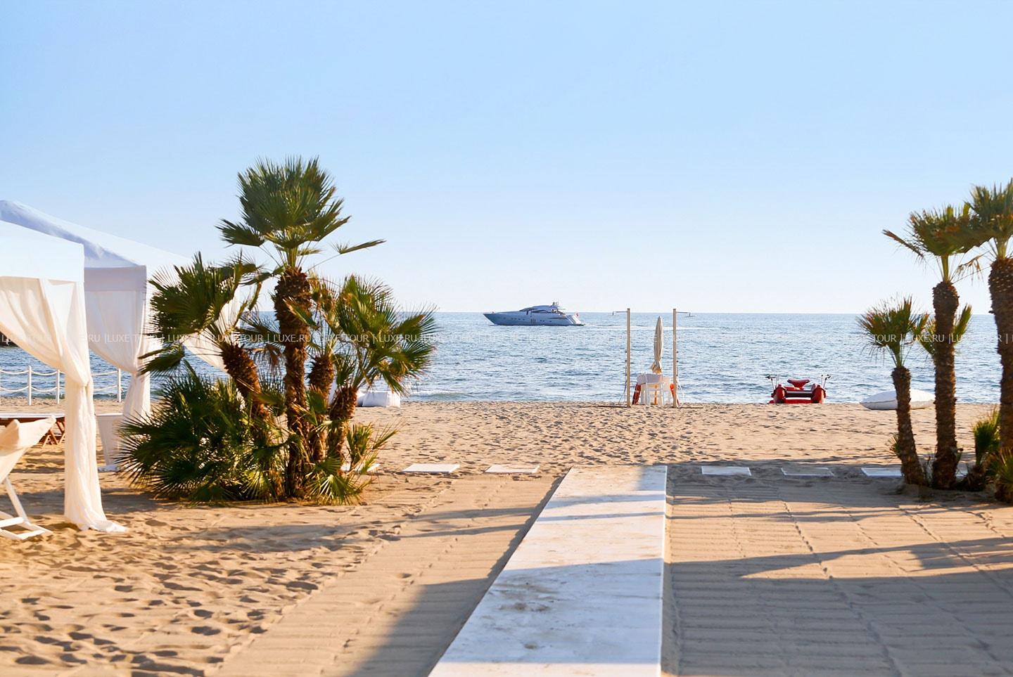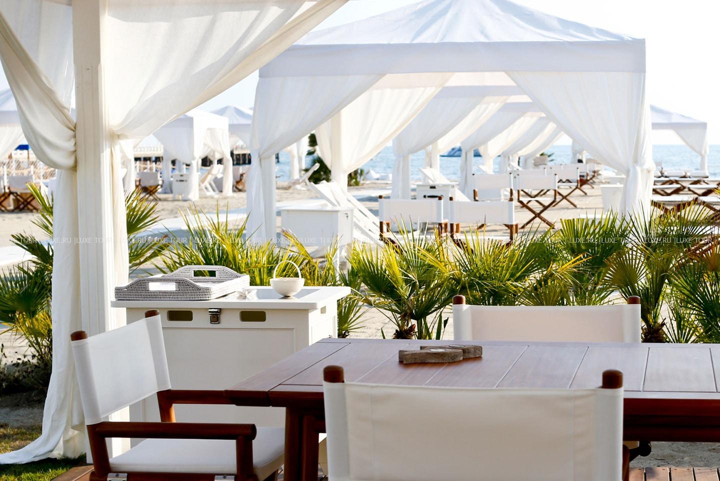Отель располагает частным песчаным пляжем с 12 оборудованными тентами и пляжным клубом.