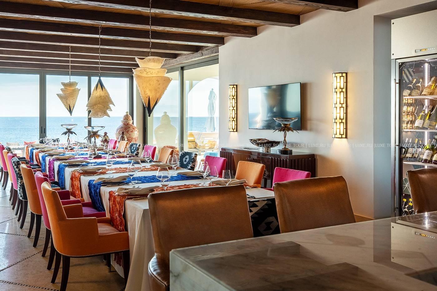• В элегантном обеденном зале, на террасах с видом на океан и за обеденным столом с очагом в центре, расположенным посреди бассейна, можно насладиться традиционными мексиканскими блюдами, деликатесами интернациональной кухни и лучшими винами из частной коллекции Олега Тинькова.