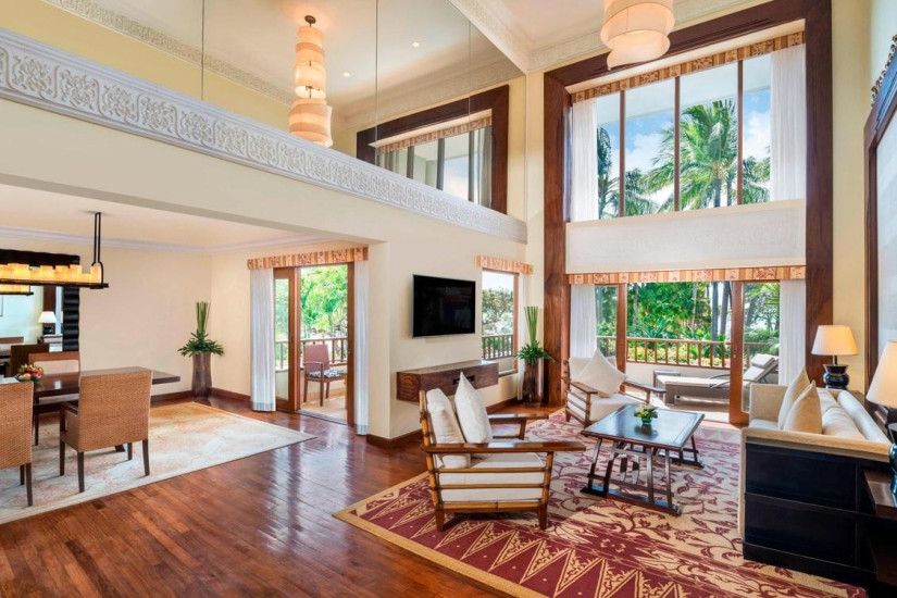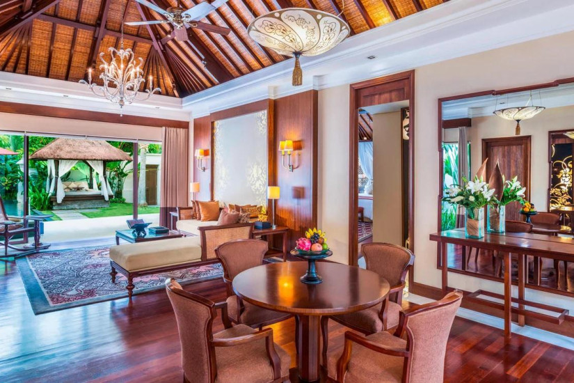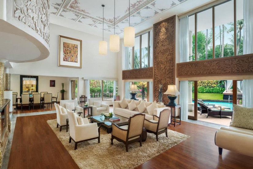 - 390 м2. Роскошный двухуровневый номер, украшенный антикварными произведениями балийского искусства, состоит из двух спален (с кроватью king-size и двумя кроватями twin), гостиной с обеденной зоной на 10 персон, музыкального салона с роялем, кухни, гардеробной, двух ванных комнат (одна с ванной и душем), гостевой туалетной комнаты, балкона, террасы с бассейном, зоной отдыха, беседкой и видом на сад и океан. Максимальное размещение – 6 человек.