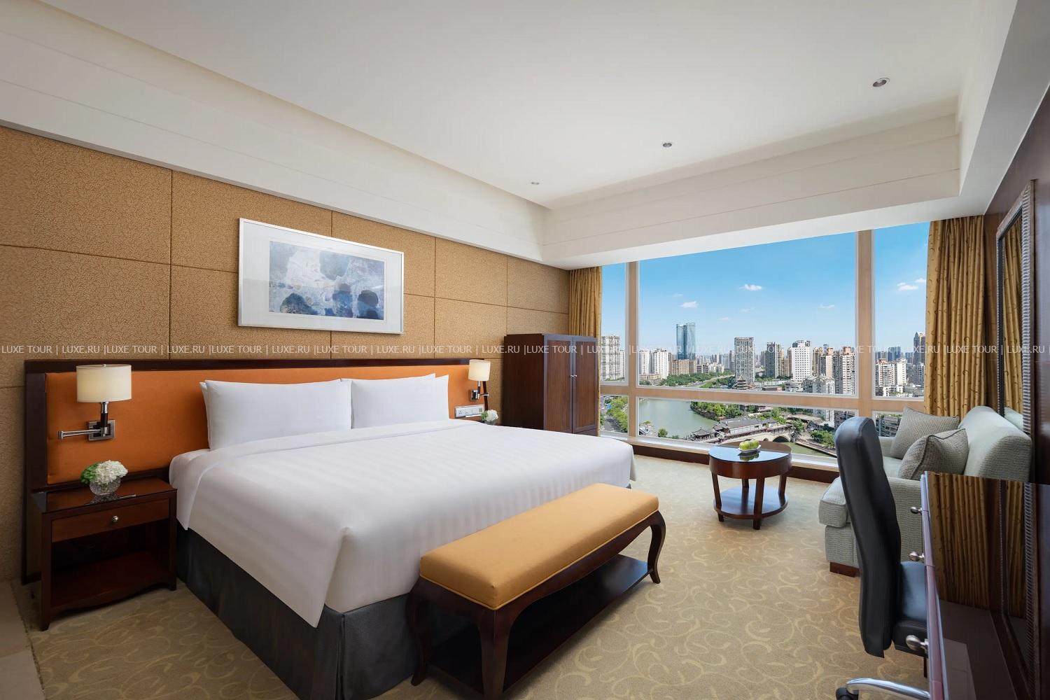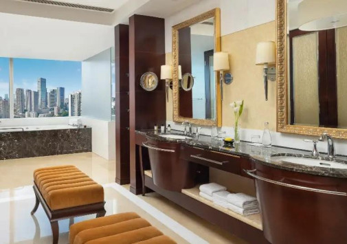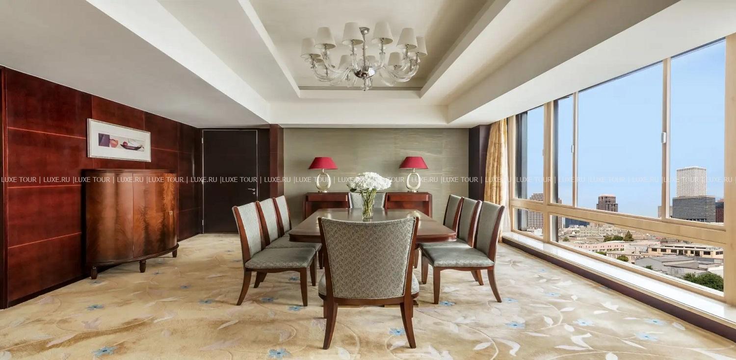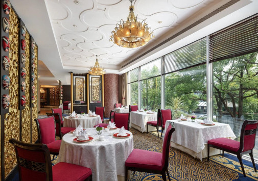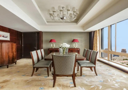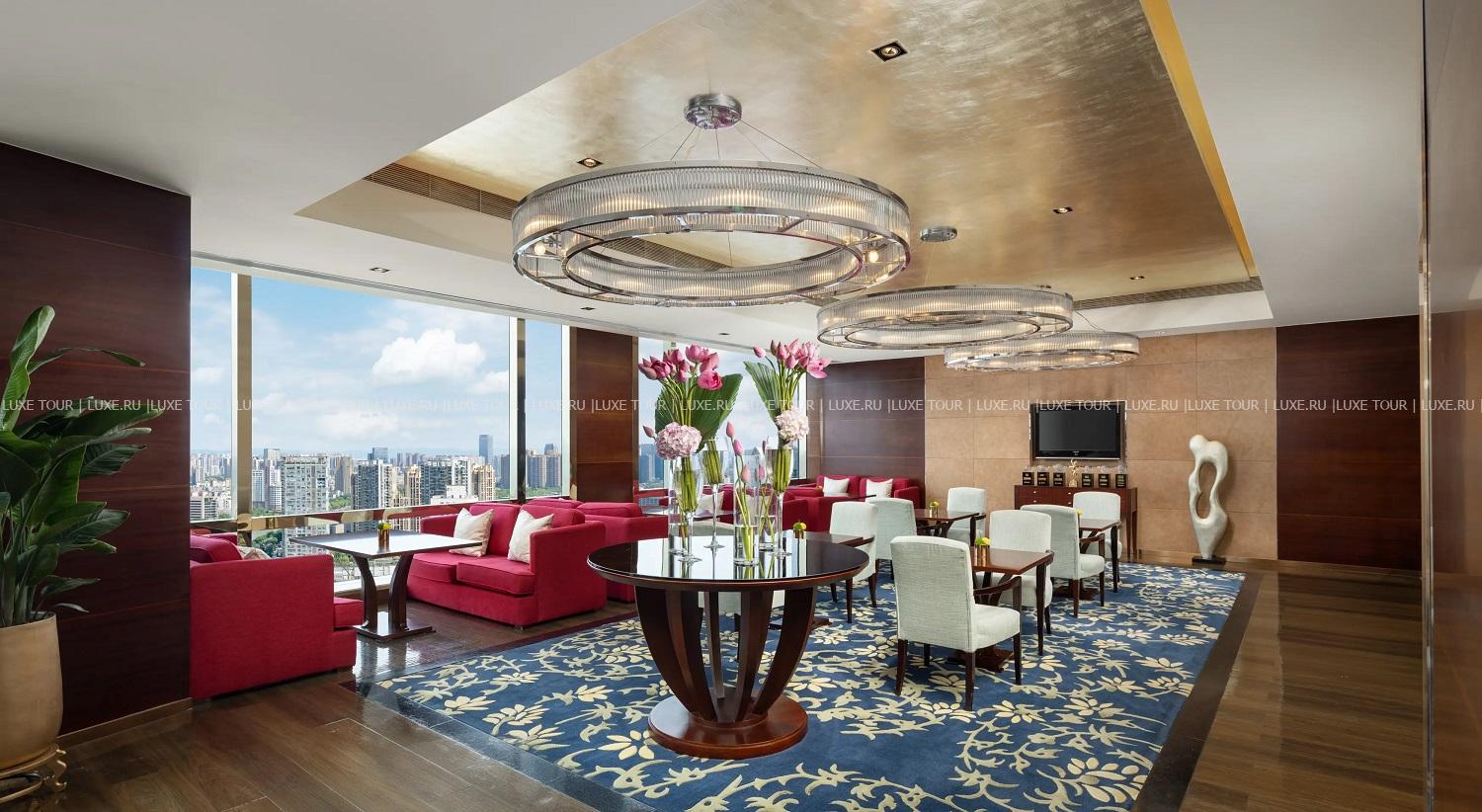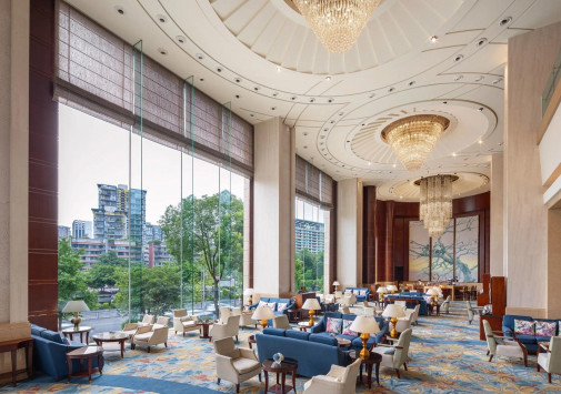 - В элегантном лобби-лаундже с панорамными 8-метровыми окнами можно выпить чашечку ароматного чая или кофе с изысканными десертами и полюбоваться великолепным видом на реку Цзинь и город.