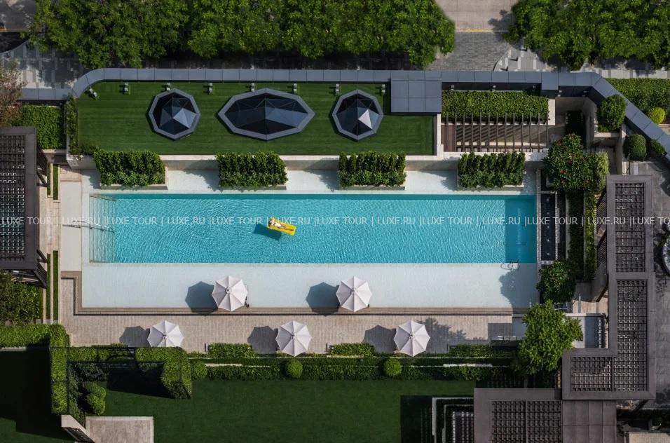 На террасе с садом и лужайками, расположенной на 5 этаже, находится большой открытый бассейн (950 м2) с панорамным видом на город.