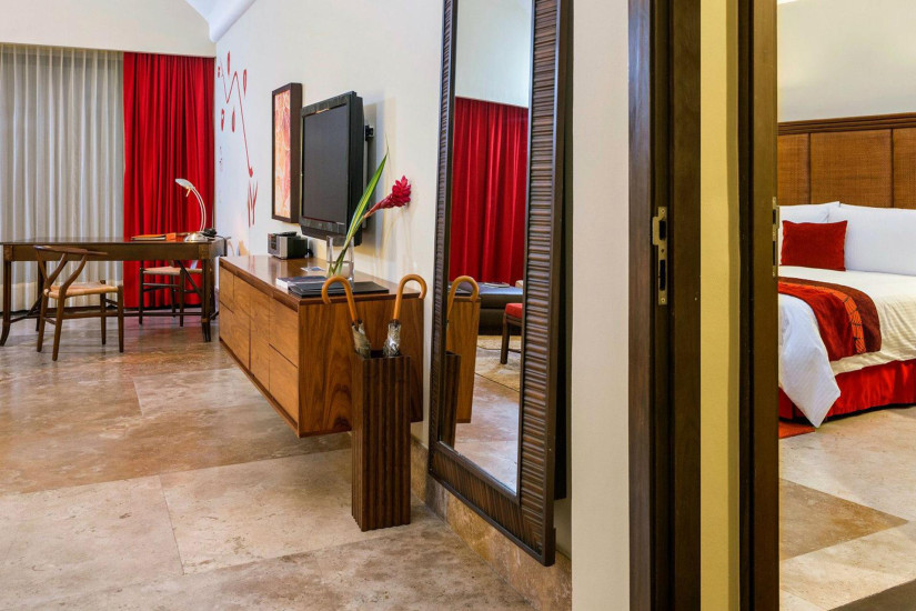 - 118 м2. Состоит из прихожей, спальни с кроватью king-size или двумя кроватями queen-size, зоны отдыха и рабочей зоны, ванной комнаты с гидромассажной ванной и отдельным душем, просторной меблированной террасы с зоной отдыха, небольшим бассейном и панорамным видом на Карибское море. Максимальное размещение - 3 взрослых + 2 ребенка (4-15 лет и 0-3).