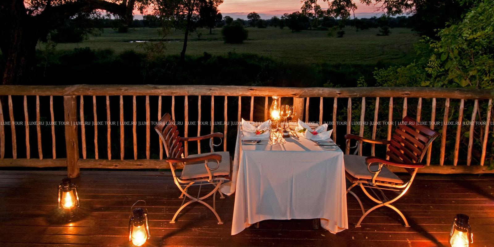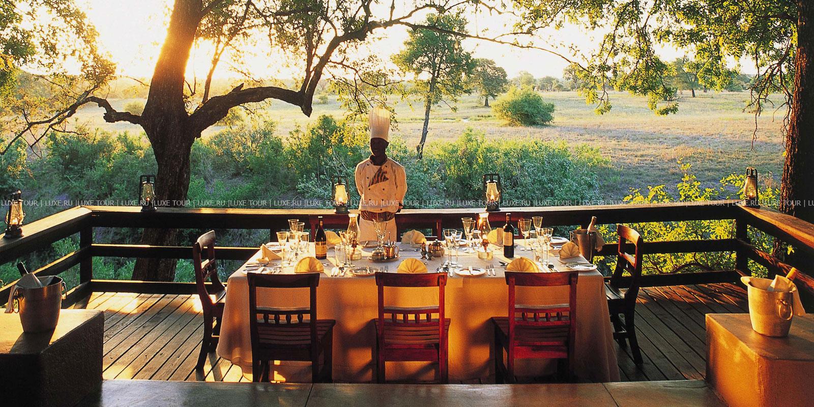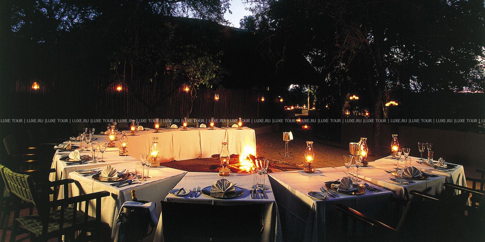 К услугам гостей6 ресторан европейской и местной южноафриканской кухни, часть которого расположена на террасе. Есть также открытый дворик «бома», оформленный в традиционном африканском стиле, предназначенный для готовки пищи на открытом огне. Здесь устраиваются вечерние ужины вокруг костра. Рядом с лобби отеля работает бар. Гости могут заказать обед в собственном номере. Кухня лоджа отличается исключительно домашними традициями приготовления блюд.