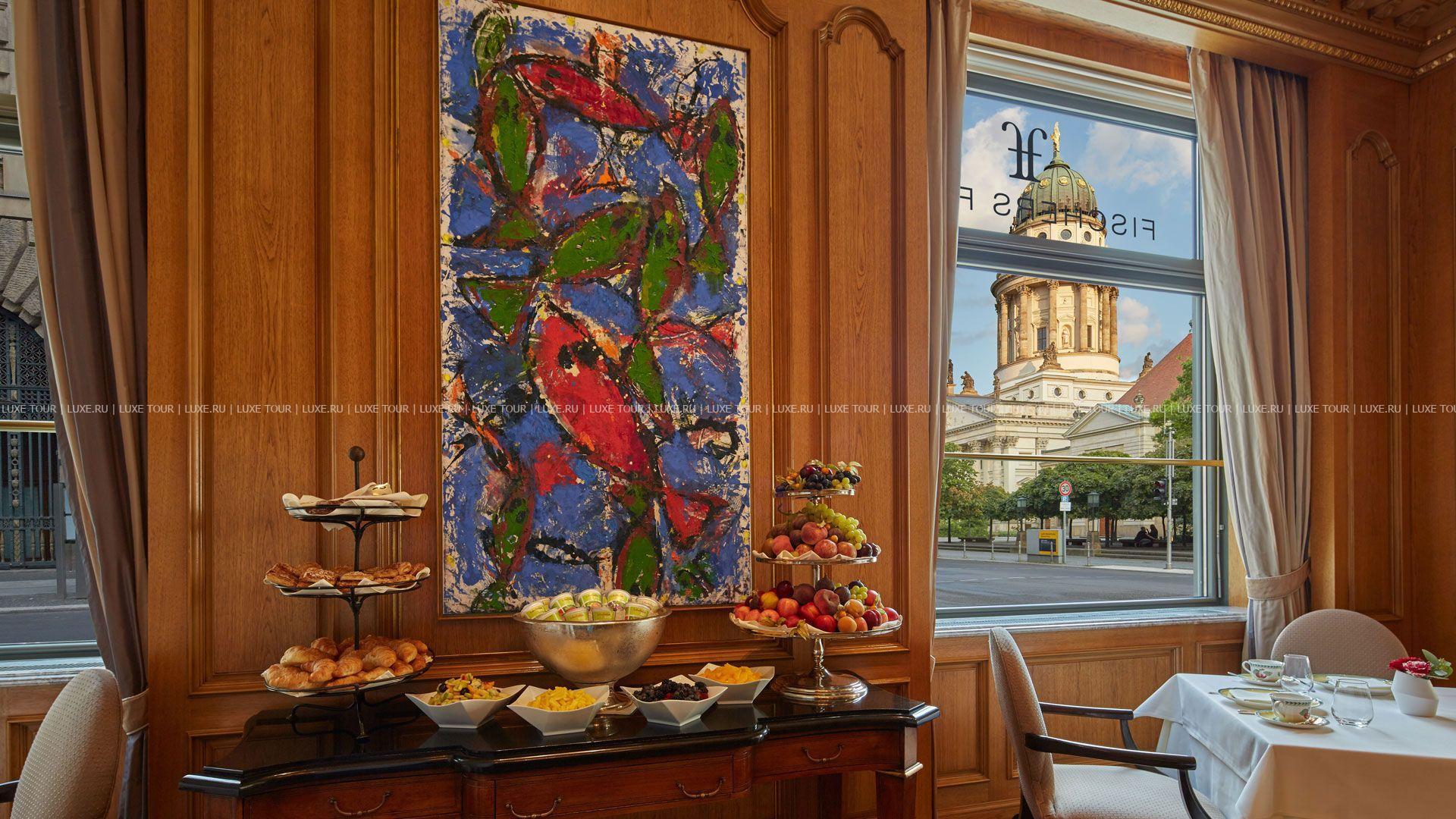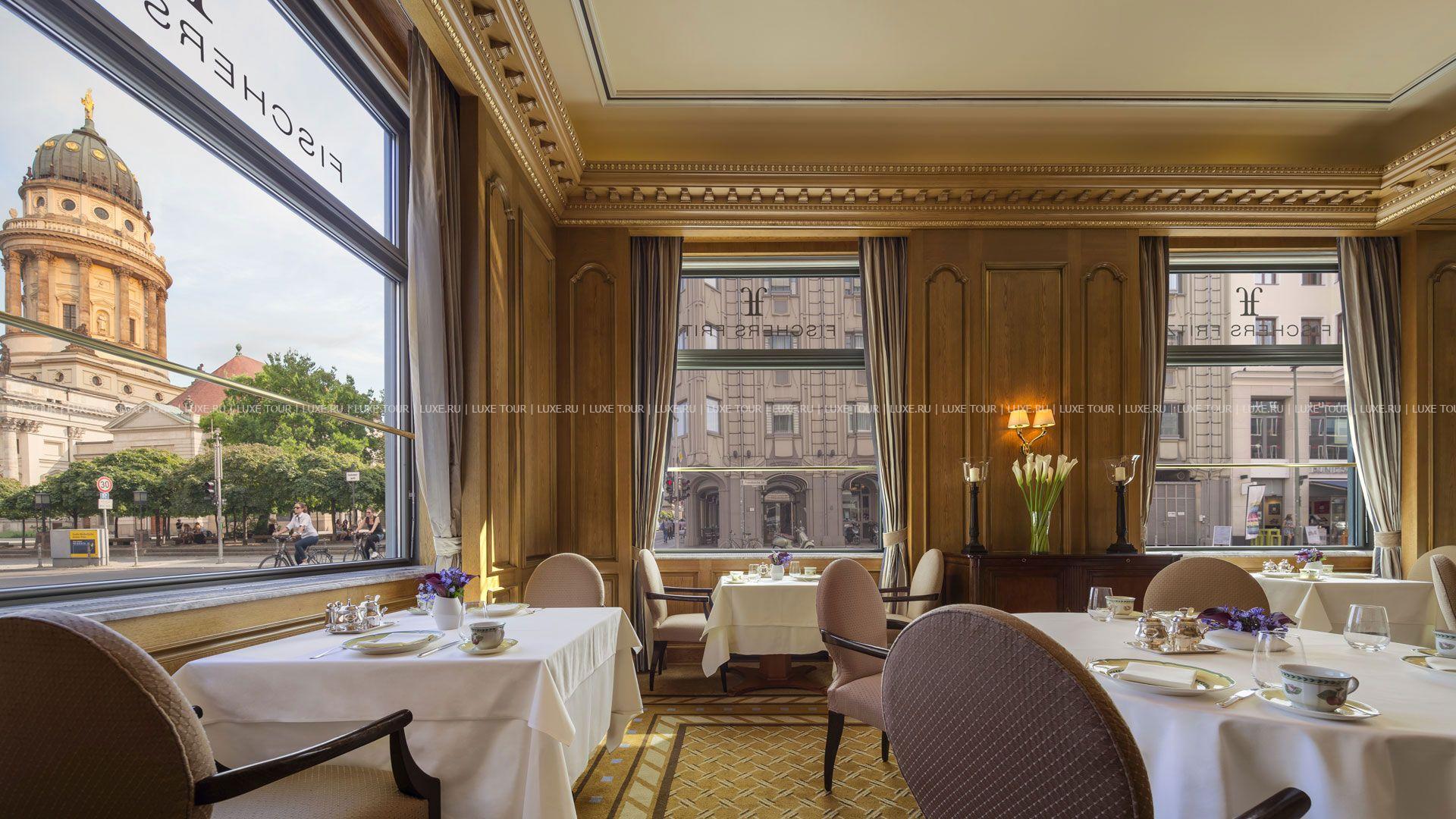 Шеф-повар ресторана Fischers Fritz Кристиан Лозе, отмеченный звездой в гиде Мишлен, приглашает гостей насладиться блюдами гастрономической кухни и видами на историческую площадь Gendarmenmarkt.