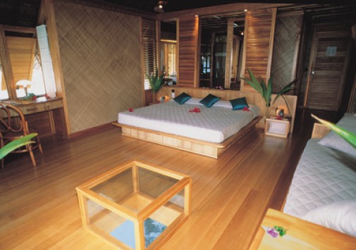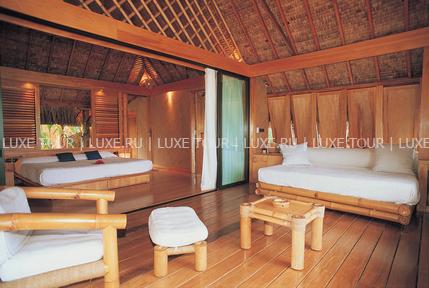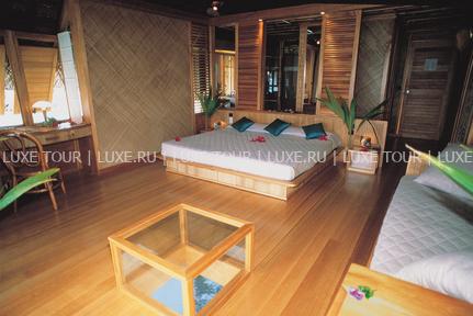 Стеклянные ночные и журнальные столики позволяют гостям бунгало на воде восхититься красочной подводной жизнью лагуны. C помощью отодвигающейся столешницы можно покормить рыбок. С просторных наружных террас приятно наслаждаться великолепным видом лагун и величественной горы Отеману.