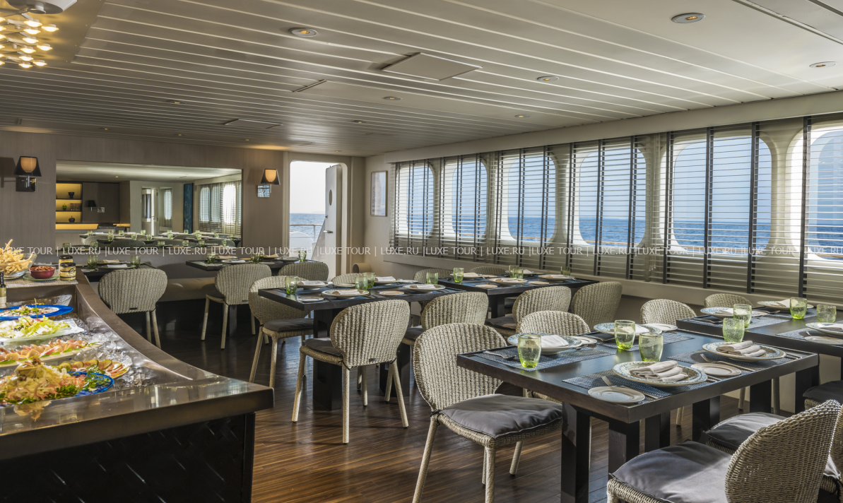 В ресторане предлагается разнообразие блюд местной и интернациональной кухонь, а в баре предложен большой выбор напитков и изысканная карта вин. Также проводятся тематические вечера, пикники и барбекю на островах. К услугам гостей – библиотека CD/DVD дисков, гостиная, телескоп для наблюдения за звездами. Круизы на Four Seasons Explorer предоставляют возможности для отдыха на любой вкус: можно исследовать подводные глубины, плавать в лазурных водах Индийского океана, загорать на белоснежных пляжах необитаемых островов, отдыхать в тени кокосовых пальм или на борту комфортабельного катамарана и, конечно, открывать удивительный мир далеких Мальдив.