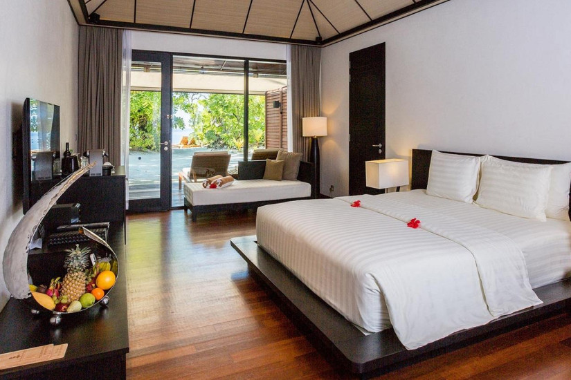 - В отеле 135 номеров, включая 57 Beach Villas, 6 Beach Family Villas, 16 Lagoon Villas, 36 Deluxe Water Villas, 4 Sunset Water Suites.
